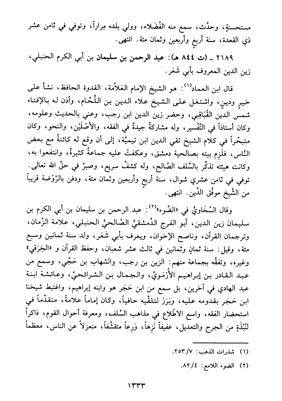 2189 - (ت 844 هـ): عبد الرحمن بن سليمان بن أبي الكرم الحنبلي، زين الدين المعروف بأبي شَعَر.
