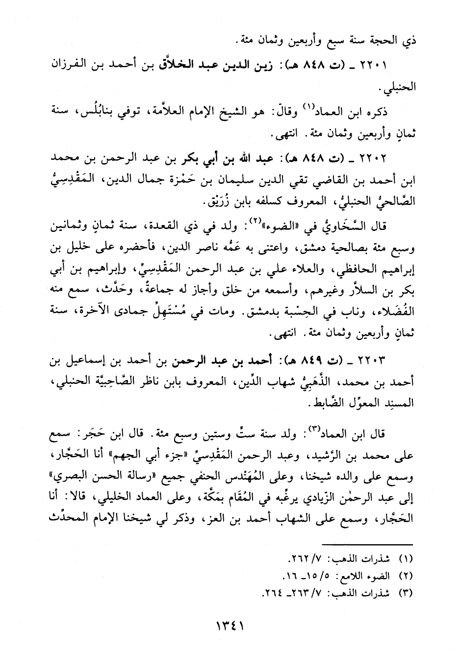 2203 - (ت 849 هـ): أحمد بن عبد الرحمن بن أحمد بن إسماعيل بن أحمد بن محمد، الذَّهَبِيُّ شهاب الدِّين، المعروف بابن ناظر الصَّاحِبيَّة الحنبلي، المسنِد المعوِّل الضَّابط.