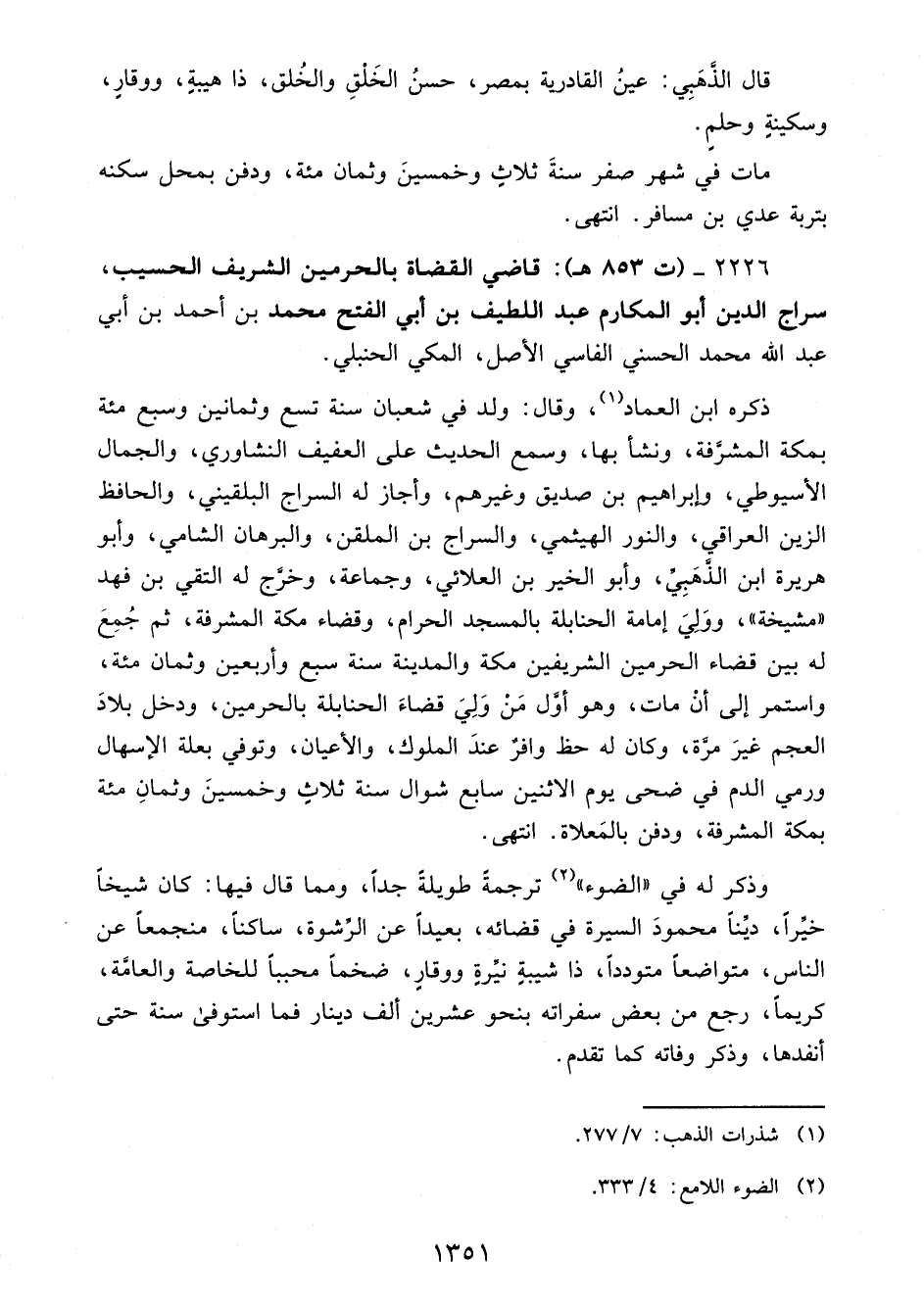 2226 - (ت 853 هـ): قاضي القضاة بالحرمين الشريف الحسيب، سراج الدين أبو المكارم عبد اللطيف بن أبي الفتح محمد بن أحمد بن أبي عبد الله محمد الحسني الفاسي الأصل، المكي الحنبلي.