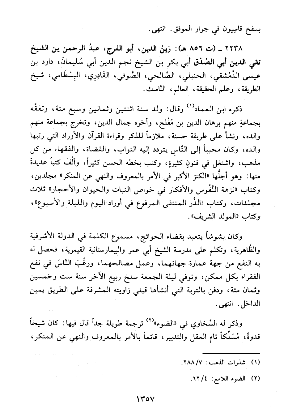 2238 - (ت 856 هـ): زينُ الدين، أبو الفرج، عبدُ الرحمن بن الشيخ تقي الدين أبي الصِّدْق أبي بكر بن الشيخ نجم الدين أبي سُليمانَ، داود بن عيسى الدِّمْشقي، الحنبلي، الصَّالحي، الصُّوفي، القَادِرِي، البِسْطَامي، شيخ الطريقة، وعلم الحقيقة، العالم، النَّاسك.