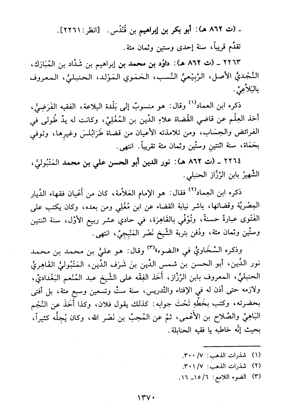 2263 - (ت 862 هـ): داوُد بن محمد بن إبراهيم بن شَدَّاد بن المُبَارَك، النَّجْديُّ الأصل، الرَّبِيْعيُّ النَّسب، الحَمَوي المَوْلد، الحنبليُّ، المعروف بالبَلَّاعِيِّ.