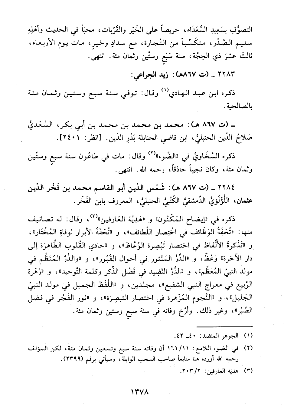 (¬2) في الضوء اللامع: 11/ 161 أن وفاته سنة سبع وتسعين وثمان مئة، لكن المؤلف رحمه الله أورده هنا متابعًا صاحب السحب الوابلة، وسيأتي برقم (2399).