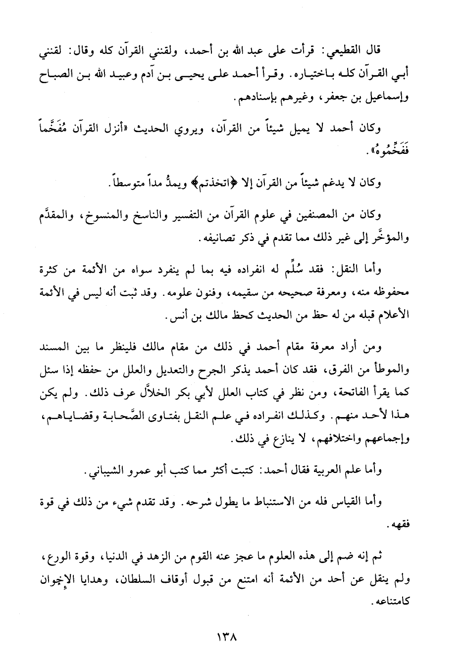ومن أراد معرفة مقام أحمد في ذلك من مقام مالك فلينظر ما بين المسند والموطأ من الفرق، فقد كان أحمد يذكر الجرح والتعديل والعلل من حفظه إذا سئل كما يقرأ الفاتحة، ومن نظر في كتاب العلل لأبي بكر الخلَّال عرف ذلك. ولم يكن هذا لأحد منهم. وكذلك انفراده في علم النقل بفتاوى الصَّحابة وقضاياهم، وإجماعهم واختلافهم، لا ينازع في ذلك.