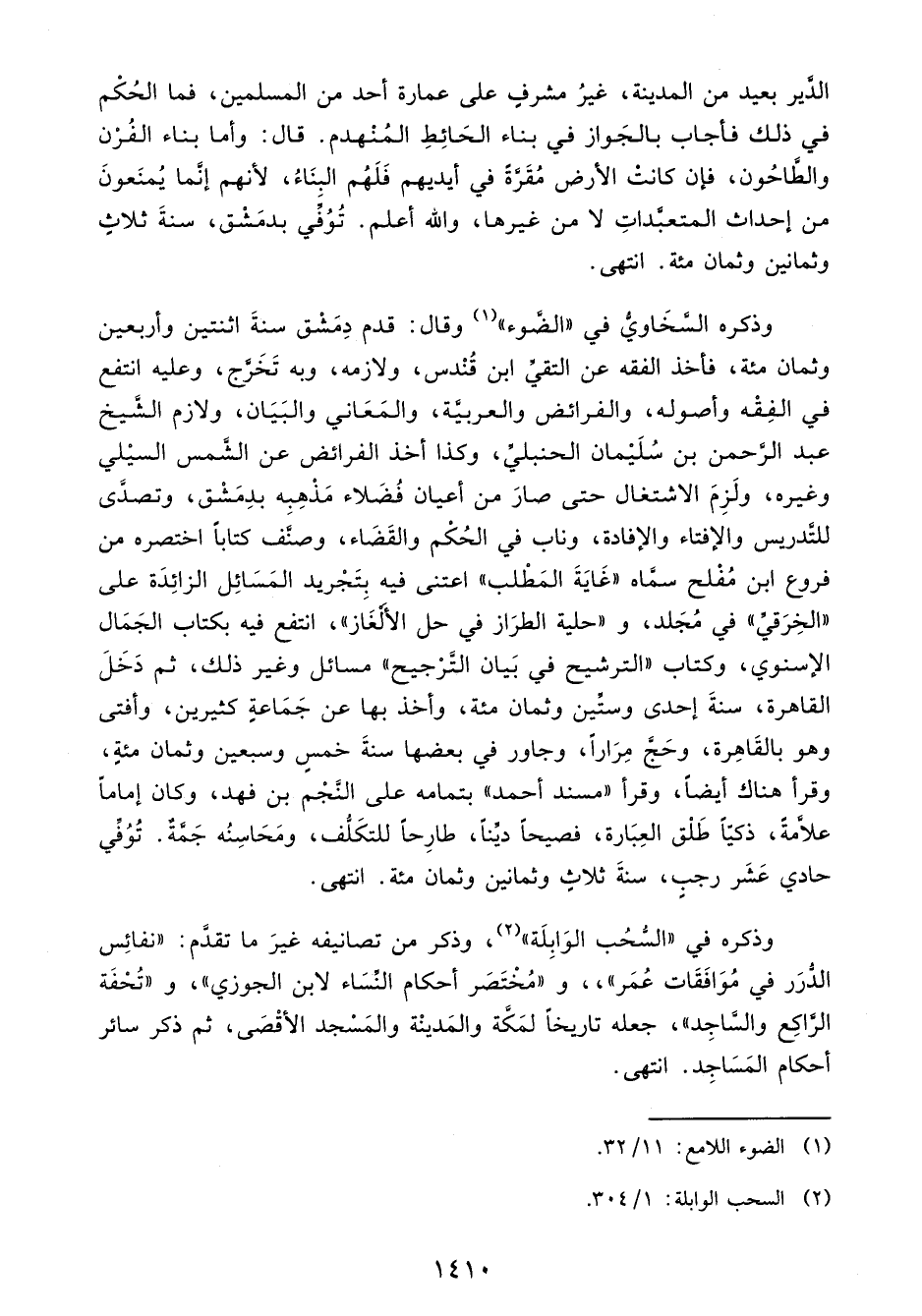 الدَّير بعيد من المدينة، غيرُ مشرفٍ على عمارة أحد من المسلمين، فما الحُكْم في ذلك فأجاب بالجَواز في بناء الحَائِطِ المُنْهدم. قال: وأما بناء الفُرْن والطَّاحُون، فإن كانتْ الأرض مُقَرَّةً في أيديهم فَلَهُم البِنَاءُ، لأنهم إنَّما يُمنَعونَ من إحداث المتعبَّداتِ لا من غيرها، والله أعلم. تُوُفَّي بدمَشْق، سنةَ ثلاثٍ وثمانين وثمان مئة. انتهى.