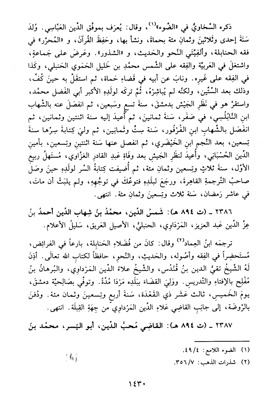 ذكره السَّخاويُّ في "الضوء" (¬1)، وقال: يُعرَف بموفَّق الدَّين العَبَّاسِي. وُلدَ سَنَةَ إحدى وثَلاثينَ وثمانِ مئة بحماةَ، ونشأ بها، وحَفِظَ القُرآنَ، و"المُحرَّر" في فقه الحنابلة، وألفِيَّتَي النَّحو والحَديث، و"الشذور". وعَرضَ على جَماعةٍ، واشتغلَ في العَربيَّة والفِقه على الشَّمس محمَّدِ بن خَليل الحَمَوي الحَنبلي، وكَذا في الفِقه على غَيرِه. ونابَ عن أبيه في قَضاءِ حَماة، ثم استقَلَّ به حينَ كُفَّ، وذلك بعد السَّتَّين، ولكنَّه لم يُباشِرْهُ، ثُمَّ تركَه لولَدِهِ الأكبر أبي الفَضل محمَّد، واستقرَّ هو في نَظَرِ الجَيْش بدمشقَ، سنةَ تسعٍ وسَبعين، ثم انفصَلَ عنه بالشَّهاب ابنِ النَّابُلُسِي، في صَفَر، سَنةَ ثمانينَ، ثم أُعيدَ إليه سنة اثنتين وثمانين، ثم انفَصَل بالشَّهاب ابنِ الفُرْفُور، سَنة سِتًّ وثَمانِين، ثم وليَ كِتابةَ سِرَّها سنةَ تِسعين، بعد النَّجَم ابنِ الخَيضَري، ثم انفصل عنها سَنة اثنتينِ وتِسعين، بأمينِ الدَّين الحُسْبَانِي، وأُعيدَ لنظَرِ الجَيشِ بعد وفَاةِ عَبدِ القادرِ الغزَّاوي، مُستَهلَّ ربيعِ الأوَّل، سنةَ ثلاثٍ وتِسعين وثمانِ مئة، ثم أُضيفت كِتابةُ السَّر لولَدِهِ حينَ وصَل صاحبُ التَّرجمةِ القاهِرةَ، ورجَعَ لبلَدِهِ فتوعَّكَ في توجُّهِهِ، ولم يلبَثْ أن ماتَ، في عاشر رَمضان، سَنة ثلاث وتِسعينَ وثمانِ مئة. انتهى.