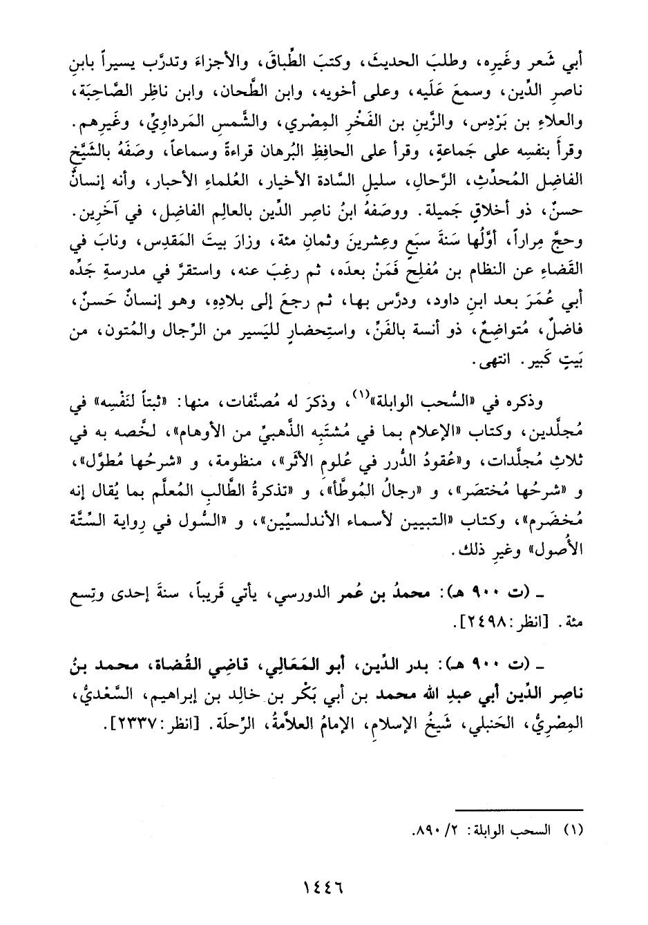 - (ت 900 هـ): بدر الدِّين، أبو المَعَالِي، قاضِي القُضاة، محمد بنُ ناصِر الدِّين أبي عبدِ الله محمد بن أبي بَكْر بن خالِد بن إبراهيم، السَّعْديُّ، المِصْرِيُّ، الحَنبلي، شَيخُ الإسلامِ، الإمامُ العلَّامةُ، الرَّحلَة. [انظر: 2337].