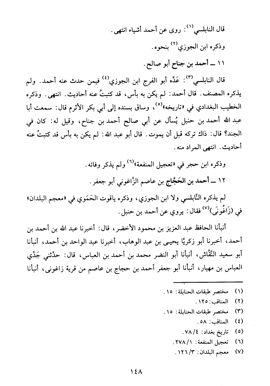 قال النابلسي (¬3): عَدَّه أبو الفرج ابن الجوزي (¬4) فيمن حدث عنه أحمد. ولم يذكره المصنف. قال أحمد: لم يكن به بأس، قد كتبتُ عنه أحاديث. انتهى. وذكره الخطيب البغدادي في "تاريخه" (¬5)، وساق بسنده إلى أبي بكر الأثرم قال: سمعت أبا عبد الله أحمد بن حنبل يُسأل عن أبي صالح أحمد بن جناح، وقيل له: كان في الجند؟ قال: ذاك تركه قبل أن يموت. قال أبو عبد الله: لم يكن به بأس قد كتبتُ عنه أحاديث. انتهى المراد منه.