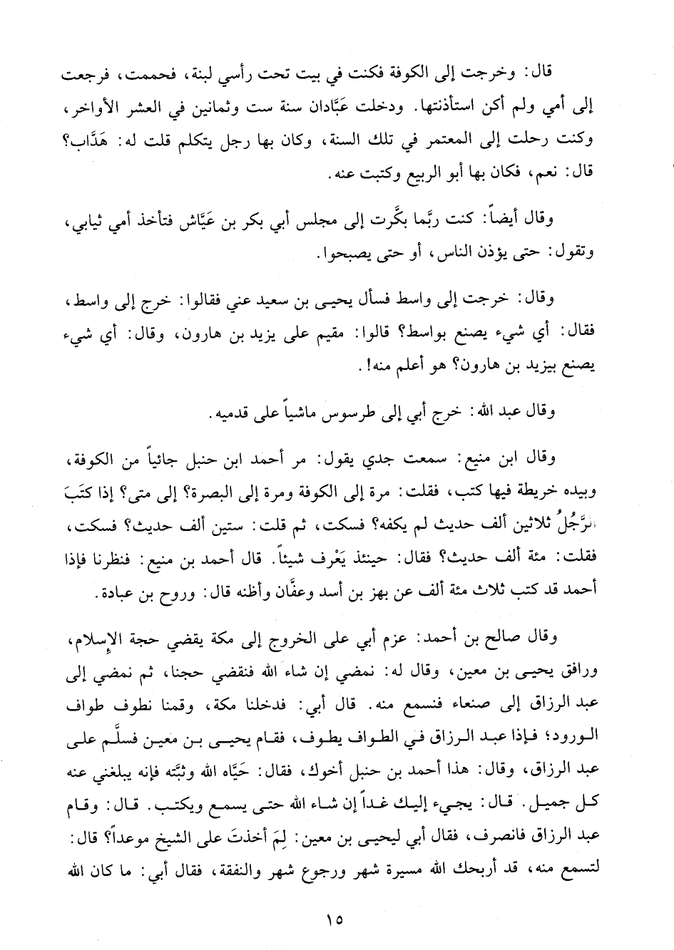 وقال صالح بن أحمد: عزم أبي على الخروج إلى مكة يقضي حجة الإِسلام، ورافق يحيى بن معين، وقال له: نمضي إن شاء الله فنقضي حجنا، ثم نمضي إلى عبد الرزاق إلى صنعاء فنسمع منه. قال أبي: فدخلنا مكة، وقمنا نطوف طواف الورود؛ فإذا عبد الرزاق في الطواف يطوف، فقام يحيى بن معين فسلَّم على عبد الرزاق، وقال: هذا أحمد بن حنبل أخوك، فقال: حَيَّاه الله وثبَّته فإنه يبلغني عنه كل جميل. قال: يجيء إليك غدًا إن شاء الله حتى يسمع ويكتب. قال: وقام عبد الرزاق فانصرف، فقال أبي ليحيى بن معين: لِمَ أخذتَ على الشيخ موعدًا؟ قال: لتسمع منه، قد أربحك الله مسيرة شهر ورجوع شهر والنفقة، فقال أبي: ما كان الله