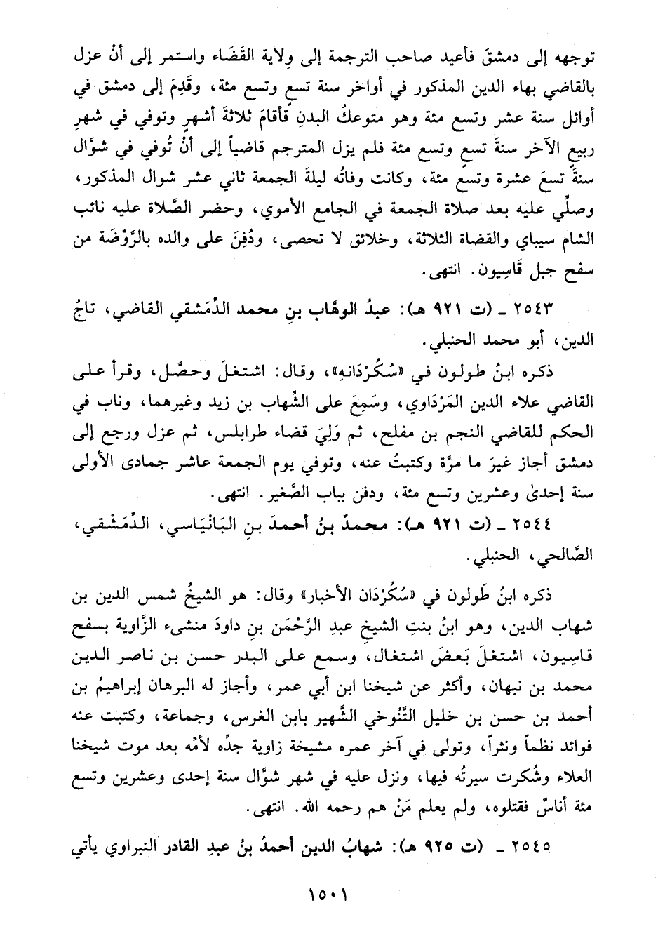 2543 - (ت 921 هـ): عبدُ الوهاب بنِ محمد الدَّمَشقي القاضي، تاجُ الدين، أبو محمد الحنبلي.