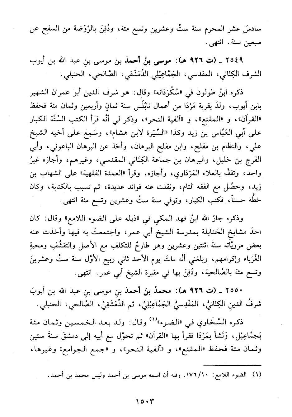 2549 - (ت 926 هـ): موسى بنُ أحمدَ بن موسى بنِ عبد الله بن أيوب الشرف الكِنَاني، المقدسي، الجَمَّاعِيْلِي الدِّمَشْقي، الصَّالحي، الحنبلي.