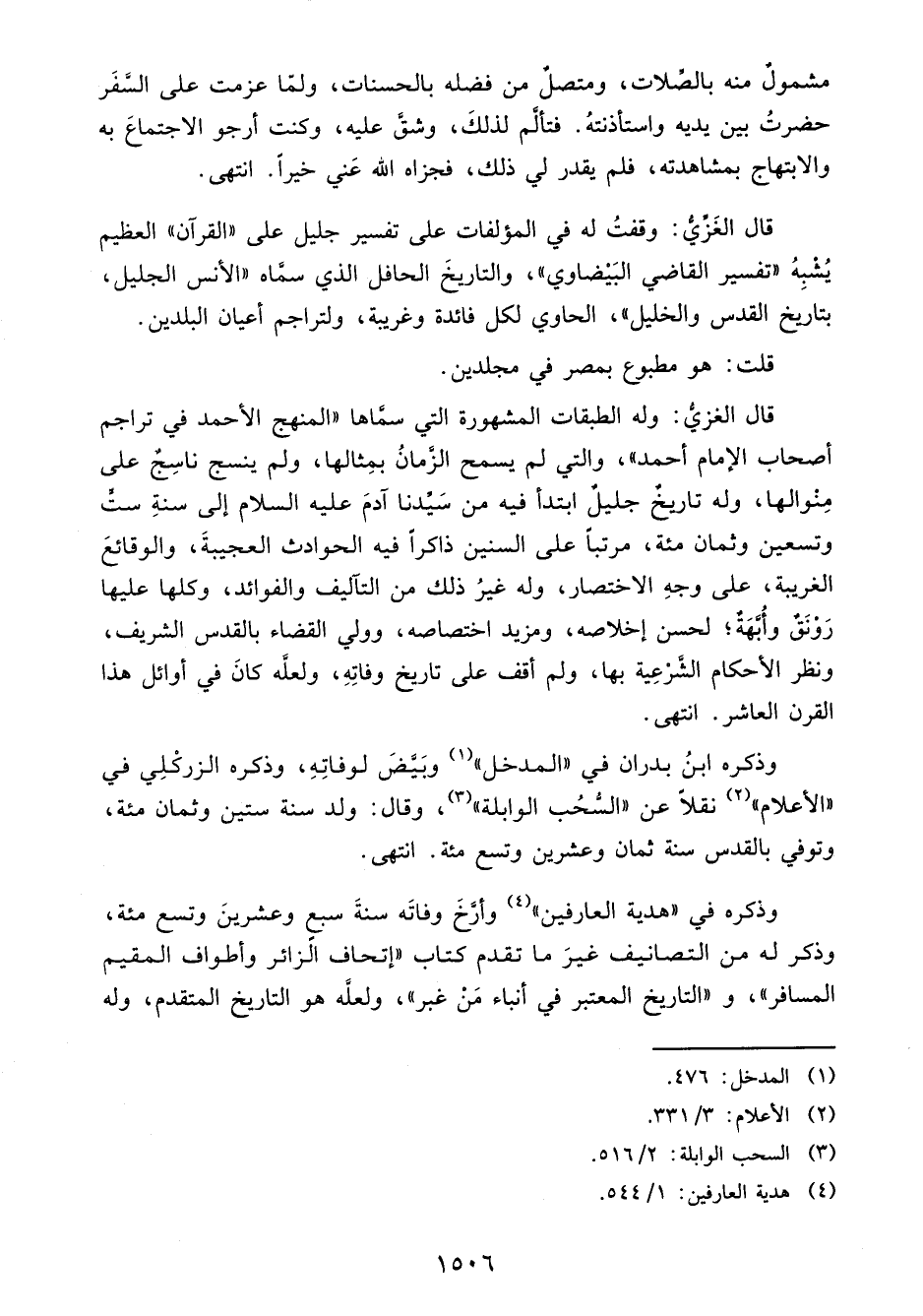 وذكره ابنُ بدران في "المدخل" (¬1) وبَيَّضَ لوفاتِهِ، وذكره الزركْلِي في "الأعلام" (¬2) نقلًا عن "السُّحُب الوابلة" (¬3)، وقال: ولد سنة ستين وثمان مئة، وتوفي بالقدس سنة ثمان وعشرين وتسع مئة. انتهى.