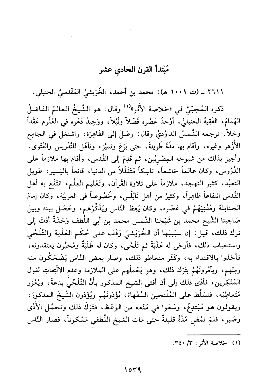ذكره المُحِبّيُّ في "خلاصة الأَثَر" (¬1) وقال: هو الشَّيخُ العالمُ الفاضلُ الهُمَامُ، الفَقِيهُ الحنبليُّ، أوْحَدُ عَصْره فَضْلًا ونُبْلًا، ووَحِيدُ دَهْره في العُلُوم عَقْدًا وحَلًا. ترجمه الشَّمسُ الداوُديُّ وقال: وصَلَ إلى القَاهِرَة، واشتغل في الجامِع الأَزْهر وغيره، وأقام بها مدَّةً طَويلةً، حتى بَرَعَ وتميَّز، وتأهَّل للتَّدريس والفَتْوى، وأجيز بذلك من شيوخِهِ المِصْرِيَّين، ثم قَدِمَ إلى القُدس، وأقام بها ملازمًا على الدُّرُوس، وكان عالمًا خاشعًا، ناسِكًا مُتَقَلَّلًا من الدنيا، قانعًا باليَسير، طويل التعبُّد، كثير التهجد، ملازمًا على تلاوة القُرآن، وتَعْليم العِلْم، انتَفَع به أهل القُدس انتفاعًا ظاهِرًا، وكثيرٌ من أهل نَابُلُسِ، وخُصُوصًا في العربيَّة، وكان إمامَ الحنابلة ومُفْتِيَهُمْ في عَصْره، وكان يَعِظ النَّاس ويُذَكَّرُهم، وحَصَل بينه وبينَ صَاحِبنا الشَّيخ محمد بن شَيْخِنا الشَّمس محمد بن أبي اللُّطف وَحْشَةٌ أدَّتْ إلى ترك ذلك، قيل: إن سبَببَها أن الخُرَيْشيَّ وَقَف على حُكْم العَذَبة والتَّلَحَّي واستحباب ذلك، فأرخى له عَذَبَةً ثم تَلحَّى، وكان له طَلَبَةٌ ومُحِبُّون يعتقدونه، فأخذوا بالاقتداء به، وكَثُر متعاطو ذلك، وصار بعض النَّاس يَضْحَكُون منه ومِنْهم، ويأمُرونَهُمْ بتَرْك ذلك، وهو يَحْملُهم على الملازمة وعدمِ الالْتِفاتِ لقول المُنْكِرين، فأدَّى ذلك إلى أن أفتى الشيخ المذكور بأَنَّ التَّلَحَّي بدعةٌ، ويُعْزر مُتَعاطِيْهِ، فتسَلَّط على المُلْتَحين السُّفَهاءُ، يُؤْذونَهُم ويُؤْذون الشَّيخَ المذكورَ، ويقولون هو مُبْتدِعٌ، وسَعَوا في منعه من الوَعْظ، فتَرَكَ ذلك وتحمَّل الأَذَى وصَبَر، فلم تَمْضِ مُدَّةٌ قليلةٌ حتى مات الشيخ اللُّطفي مَسْكوتًا، فصار النَّاس