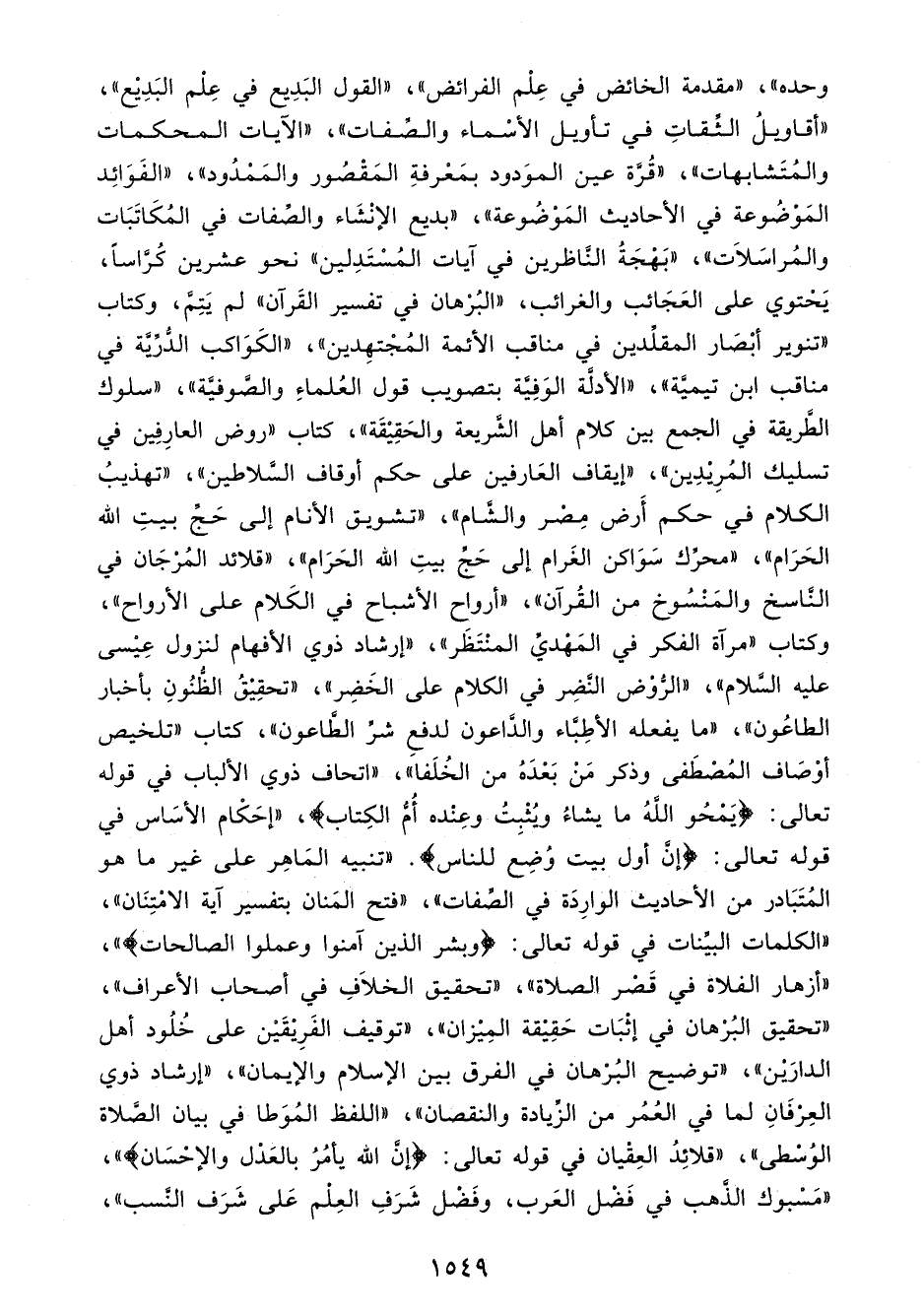 وحده"، "مقدمة الخائض في عِلْم الفرائض"، "القول البَدِيع في عِلْم البَدِيْع"، "أقاويلُ الثِّقاتِ في تأويل الأسْماء والصِّفات"، "الآيات المحكمات والمُتَشابهات"، "قُرَّة عين الموَدود بمَعْرفةِ المَقْصُور والمَمْدُود"، "الفَوَائِد المَوْضُوعة في الأحاديث المَوْضُوعة"، "بديع الإنْشَاء والصِّفات في المُكَاتَبَات والمُراسَلاَت"، "بَهْجَةُ النَّاظرين في آيات المُسْتَدِلين" نحو عشرين كُرَّاسًا، يَحْتوي على العَجَائب والغرائب، "البُرْهان في تفسير القَرآن" لم يَتِمَّ، وكتاب "تنوير أبْصَار المقلِّدين في مناقب الأئمة المُجْتهِدين"، "الكَوَاكب الدُّرِّيَّة في مناقب ابن تيميَّة"، "الأدلَّة الوَفِيَّة بتصويب قول العُلماءِ والصَّوفيَّة"، "سلوك الطَّريقة في الجمع بين كلام أهل الشَّريعة والحَقِيْقَة"، كتاب "روض العارِفِين في تسليك المُرِيْدِين"، "إيقاف العَارفين على حكم أوقاف السَّلاطين"، "تهذيبُ الكلام في حكم أَرض مِصْر والشَّام"، "تشويق الأنام إلى حَجِّ بيتِ الله الحَرَام"، "محرِّك سَوَاكن الغَرام إلى حَجِّ بيتِ الله الحَرَام"، "قلائد المُرْجَان في النَّاسخ والمَنْسُوخ من القُرآن"، "أرواح الأشباح في الكَلام على الأرواح"، وكتاب "مرآة الفكر في المَهْديِّ المنْتَظَر"، "إرشاد ذوي الأفهام لنزول عِيْسى عليه السَّلام"، "الرُّوْض النَّضِر في الكلام على الخَضِر"، "تحقِيْقُ الظُّنُونِ بأخبار الطاعُون"، "ما يفعله الأطِبَّاء والدَّاعون لدفعِ شرِّ الطَّاعون"، كتاب "تلخيص أوْصَاف المُصْطَفى وذكر مَنْ بَعْدَهُ من الخُلَفا"، "اتحاف ذوي الألباب في قوله تعالى: {يَمْحُو اللَّهُ مَا يَشَاءُ وَيُثْبِتُ وَعِنْدَهُ أُمُّ الْكِتَابِ}، "إحَكْام الأسَاس في قوله تعالى: {إِنَّ أَوَّلَ بَيْتٍ وُضِعَ لِلنَّاسِ}. "تنبيه المَاهِر على غير ما هو المُتَبَادر من الأحاديث الوارِدَة في الصِّفات"، "فتح المَنان بتفسير آية الامْتِنَان"، "الكلمات البيِّنات في قوله تعالى: {وَبَشِّرِ الَّذِينَ آمَنُوا وَعَمِلُوا الصَّالِحَاتِ} "، "أزهار الفلاة في قَصْر الصلاة"، "تحقيق الخلَافِ في أصحاب الأعراف"، "تحقيق البُرْهان في إثْبَات حَقِيْقة المِيْزان"، "توقيف الفَرِيْقَيْن على خُلُود أهل الدارَيْن"، "توضيح البُرْهان في الفرق بين الإسلام والإيمان"، "إرشاد ذوي العِرْفَانِ لما في العُمُر من الزِّيادة والنقصان"، "اللفظ المُوَطا في بيان الصَّلاة الوُسْطى"، "قلائِدُ العِقْيان في قوله تعالى: {إِنَّ اللَّهَ يَأْمُرُ بِالْعَدْلِ وَالْإِحْسَانِ} "، "مَسْبوك الذَّهب في فَضْل العَرب، وفَضْل شَرَفِ العِلْم عَلى شَرَف النَّسب"،