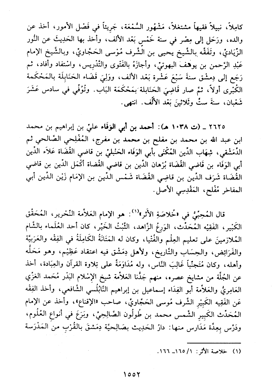 2625 - (ت 1038 هـ): أحمد بن أبي الوَفَاء عليِّ بن إبراهيم بن محمد ابن عبد الله بن محمد بن مفلح بن محمد بن مفرج، المُفْلِحي الصَّالحي ثم الدِّمَشْقي، شِهَاب الدِّين المُكْنَى بأبي الوَفَاء الحَنْبليِّ بن قاضي القُضَاة عَلاَء الدِّين أبي الوَفَاء بن قَاضي القُضَاة بُرْهان الدِّين بن قاضي القُضاة أكْمَل الدِّين بن قاضي القُضَاة شَرَف الدِّين بن قاضِي القُضَاة شَمْس الدِّين بن الإمَام زَيْن الدِّين أبي المفاخر مُفْلح، المَقْدِسِي الأصل.
