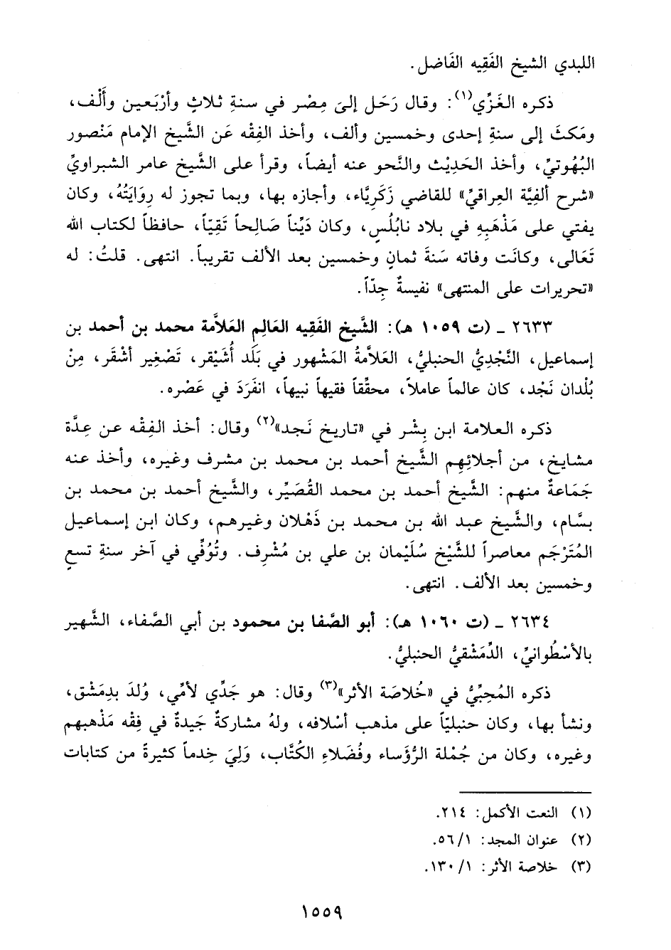 2633 - (ت 1059 هـ): الشَّيخ الفَقِيه العَالِم العَلَّامة محمد بن أحمد بن إسماعيل، النَّجْدِيُّ الحنبليُّ، العَلَّامةُ المَشْهور في بَلَد أُشَيْقر، تَصْغِير أشْقَر، مِنْ بُلْدان نَجْد، كان عالمًا عاملًا، محقِّقًا فقيهًا نبيهًا، انفَرَدَ في عَصْره.