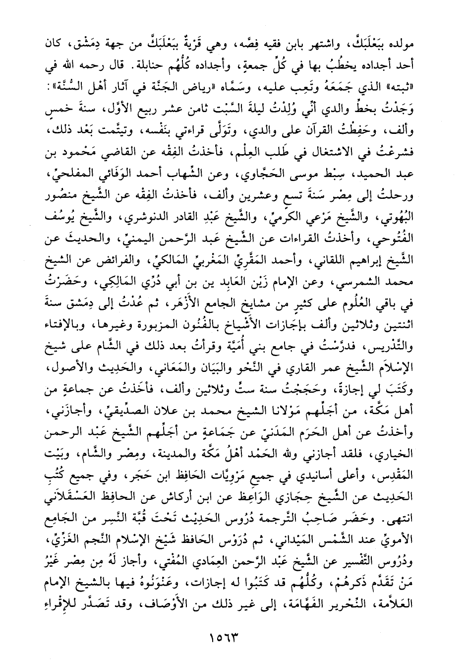 مولده ببَعْلَبَكَّ، واشتهر بابن فقيه فِصَّه، وهي قَرْيةٌ ببَعْلَبَكَّ من جهة دِمَشْق، كان أحد أجداده يخطُبُ بها في كُلِّ جمعةٍ، وأجداده كُلُّهُم حنابلة. قال رحمه الله في "ثبته" الذي جَمَعَهُ وتَعِب عليه، وسَمَّاه "رياض الجَنَّة في آثار أهْل السُّنَّة": وَجَدْتُ بخطِّ والدي أنِّي وُلِدْتُ ليلةَ السَّبْت ثامن عشر ربيع الأوَّل، سنةَ خمسٍ وألف، وحَفِظْتُ القرآن على والدي، وتَوَلَّى قراءتي بنَفْسه، وتيتَّمت بَعْد ذلك، فشرعْتُ في الاشتغال في طَلب العِلْم، فأخذتُ الفِقْه عن القاضي مَحْمود بن عبد الحميد، سِبْط موسى الحَجَّاوي، وعن الشِّهاب أحمد الوَفَائي المفلحيِّ، ورحلتُ إلى مِصْر سَنةَ تسعٍ وعشرين وألف، فأخذتُ الفِقْه عن الشَّيخ منصُور البُهُوتي، والشَّيخ مَرْعي الكرَميِّ، والشَّيخ عَبْدِ القادر الدنوشري، والشَّيخ يُوسُف الفُتُوحي، وأخذتُ القراءات عن الشَّيخ عَبد الرَّحمن اليمنيِّ، والحديثَ عن الشَّيخ إبراهيم اللقاني، وأحمد المَقَّرِيِّ المَغْربيِّ المَالكيِّ، والفرائض عن الشَّيخ محمد الشمرسي، وعن الإمام زَيْن العَابِدين بن أبي دُرِّي المَالِكِي، وحَضَرْتُ في باقي العُلُوم على كثيرٍ من مشايخ الجامع الأزْهَر، ثم عُدْتُ إلى دِمَشق سنةَ اثنتين وثلاثين وألف بإجَازات الأشْياخ بالفُنُون المزبورة وغيرها، وبالإفتاء والتَّدْريس، فدرَّسْتُ في جامع بني أُمَيَّة وقرأتُ بعد ذلك في الشَّام على شيخ الإسْلَام الشَّيخ عمر القاري في النَّحْو والبَيَان والمَعَاني، والحَدِيث والأصول، وكَتَبَ لي إجازةً، وحَجَجْتُ سنة ستٍّ وثلاثين وألف، فأخَذتُ عن جماعةٍ من أهل مَكَّة، من أجَلِّهم مَوْلانا الشَّيخ محمد بن علان الصدِّيقيِّ، وأجازَني، وأخذتُ عن أهل الحَرَم المَدَنيّ عن جَمَاعةٍ من أجَلِّهم الشَّيخ عَبْد الرحمن الخياري، فلقد أجازني ولله الحَمْد أهْلُ مَكَّة والمدينة، ومِصْر والشَّام، وبَيْت المَقْدِس، وأعلى أسانيدي في جميعِ مَرْوِيَّات الحَافِظ ابن حَجَر، وفي جميع كُتُبِ الحَدِيث عن الشَّيخ حِجَازي الوَاعِظ عن ابن أركاش عن الحافِظ العَسْقَلَاني انتهى. وحَضَر صَاحِبُ التَّرجمة دُرُوس الحَدِيْث تَحْتَ قُبَّة النَّسِر من الجَامِع الأمويِّ عند الشَّمْس المَيْداني، ثم دُرَوْس الحَافظ شَيْخ الإسْلام النَّجم الغَزِّيِّ، ودُرُوس التَّفْسير عن الشَّيخ عَبْد الرَّحمن العِمَادي المُفْتي، وأجاز لَهُ مِن مِصْر غَيْرُ مَنْ تَقَدَّم ذَكرهُمْ، وكُلُّهُم قد كَتَبُوا له إجازات، وعَنْوَنُوهُ فيها بالشيخ الإمام العَلَّامة، النِّحْرير الفَهَّامَة، إلى غير ذلك من الأَوْصَاف، وقد تَصَدَّر للإِقْراءِ