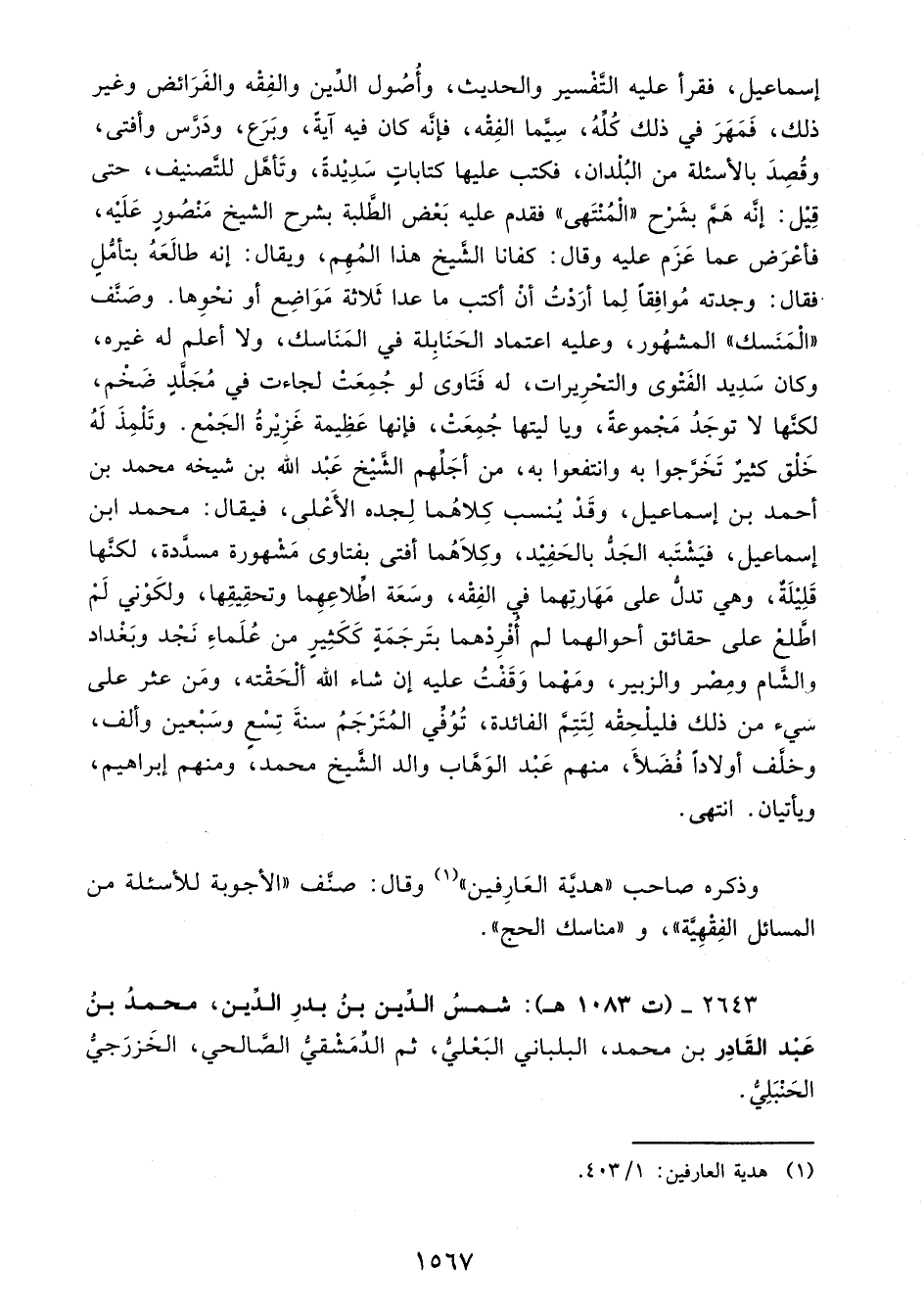 إسماعيل، فقرأ عليه التَّفْسير والحديث، وأُصُول الدِّين والفِقْه والفَرَائض وغير ذلك، فَمَهَرَ في ذلك كُلِّه، سِيَّما الفِقْه، فإنه كان فيه آيةً، وبَرَع، ودَرَّس وأفتى، وقُصِدَ بالأسئلة من البُلْدان، فكتب عليها كتاباتٍ سَدِيْدةً، وتَأهَّل للتَّصنيف، حتى قِيْل: إنه هَمَّ بشَرْح "الْمُنْتَهى" فقدم عليه بَعْض الطَّلبة بشرح الشَّيخ مَنْصُورٍ عَلَيْه، فأعْرَض عما عَزَم عليه وقال: كفانا الشَّيخ هذا المُهِم، ويقال: إنه طالَعَهُ بتأمُّلٍ فقال: وجدته مُوافِقًا لِما أرَدْتُ أنْ أكتب ما عدا ثَلاثة مَوَاضِع أو نحْوِها. وصَنَّف "الْمَنَسك" المشهُور، وعليه اعتماد الحَنَابِلة في المَنَاسك، ولا أعلم له غيره، وكان سَدِيد الفَتْوى والتحْرِيرات، له فَتَاوى لو جُمِعَتْ لجاءت في مُجَلَّدٍ ضَخْم، لكنَّها لا توجَدُ مَجْموعةً، ويا ليتها جُمِعَتْ، فإنها عَظِيمة غَزِيْرةُ الجَمْع. وتَلْمِذَ لَهُ خَلْق كثيرٌ تَخَرَّجوا به وانتفعوا به، من أجَلِّهم الشَّيْخ عَبْد الله بن شيخه محمد بن أحمد بن إسماعيل، وقَدْ يُنسب كِلاهُما لِجده الأَعْلى، فيقال: محمد ابن إسماعيل، فيَشْتَبه الجَدُّ بالحَفِيْد، وكِلَاهُما أفتى بفتاوى مَشْهورة مسدَّدة، لكنَّها قَلِيْلَةٌ، وهي تدلُّ على مَهَارتِهما في الفِقْه، وسَعَة اطِّلاعِهِما وتحقِيقِها، ولكَوْني لَمْ اطَّلعْ على حقائق أحوالهما لم أُفْرِدْهما بتَرجَمَةٍ كَكَثِيرٍ من عُلَماءِ نَجْد وبَغْداد والشَّام ومِصْر والزبير، ومَهْما وَقَفْتُ عليه إن شاء الله ألْحَقْته، ومَن عثر على شيء من ذلك فليلْحِقْه لِتَتِمَّ الفائدة، تُوُفِّي المُتَرْجَمُ سنةَ تِسْعٍ وسَبْعين وألف، وخلَّف أولادًا فُضَلأَ، منهم عَبْد الوَهَّاب والد الشَّيخ محمد، ومنهم إبراهيم، ويأتيان. انتهى.