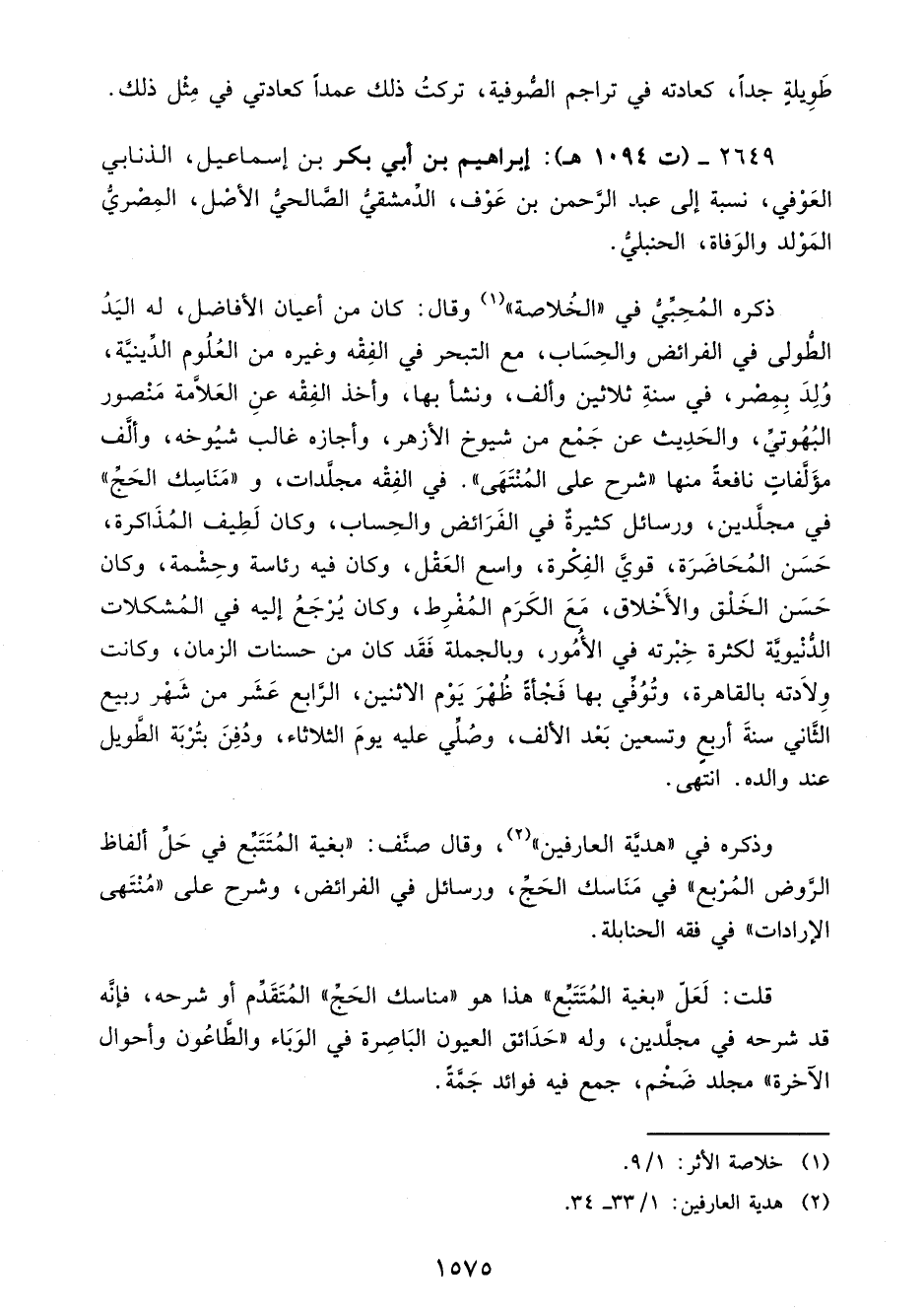 2649 - (ت 1094 هـ): إبراهيم بن أبي بكر بن إسماعيل، الذنابي العَوْفي، نسبة إلى عبد الرَّحمن بن عَوْف، الدِّمشقيُّ الصَّالحيُّ الأصْل، المِصْريُّ المَوْلد والوَفاة، الحنبليُّ.