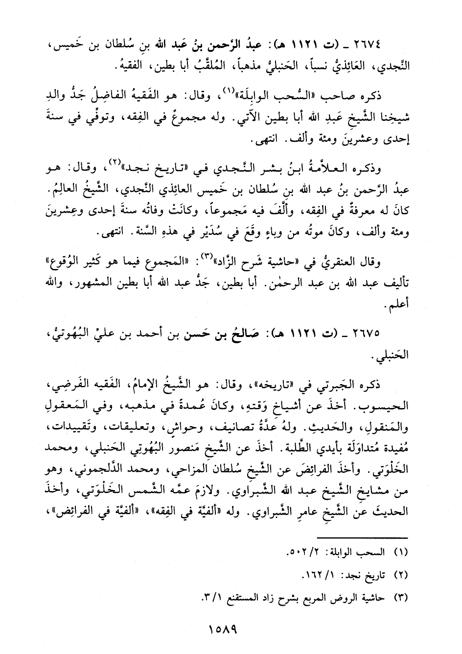 2674 - (ت 1121 هـ): عبدُ الرَّحمن بنُ عَبد الله بنِ سُلطان بن خَميس، النَّجدي، العَائِذيُّ نسبًا، الحَنبليُّ مذهبًا، المُلقَّبُ أبا بطين، الفقيهُ.