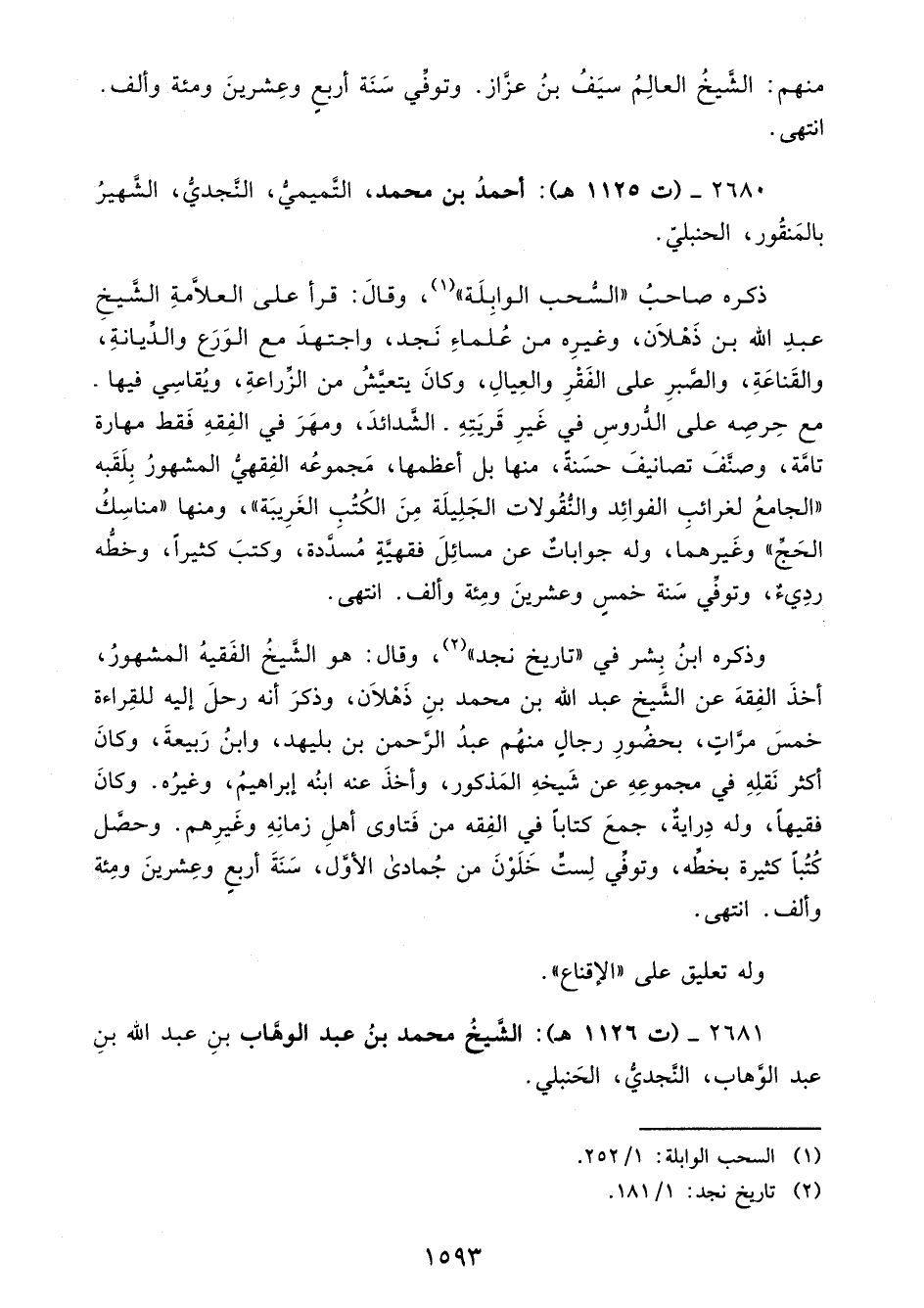 وذكره ابنُ بِشر في "تاريخ نجد" (¬2)، وقال: هو الشَّيخُ الفَقيهُ المشهورُ، أخذَ الفِقهَ عن الشَّيخ عبد الله بن محمد بنِ ذَهْلَان، وذكرَ أنه رحلَ إليه للقِراءة خمسَ مرَّاتٍ، بحضُورِ رجالٍ منهُم عبدُ الرَّحمن بن بليهد، وابنُ رَبيعةَ، وكانَ أكثر نَقلِهِ في مجموعِهِ عن شَيخهِ المَذكور، وأخذَ عنه ابنُه إبراهيمُ، وغيرُه. وكانَ فقيهًا، وله دِرايةٌ، جمعَ كتابًا في الفِقه من فتاوى أهلِ زمانِهِ وغَيرِهم. وحصَّل كُتُبًا كثيرة بخطِّه، وتوفِّي لِستٍّ خَلَوْنَ من جُمادى الأوَّل، سَنَةَ أربعٍ وعِشرينَ ومِئة وألف. انتهى.