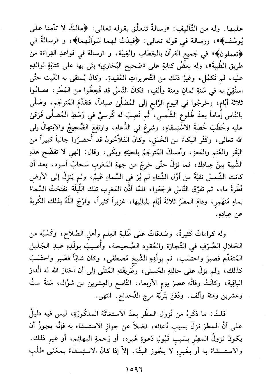 عليها. وله من التَّآليفِ: "رسالةٌ تتعلَّق بقوله تعالى: {مَا لَكَ لَا تَأْمَنَّا عَلَى يُوسُفَ} "، ورسالة في قوله تعالى: {فَبَدَتْ لَهُمَا سَوْآتُهُمَا}، و"رسالةٌ في {تَعْمَلُونَ} " في جَميعِ القرآن بالخِطابِ والغِيبَة، و"رسالةٌ في قواعدِ القِراءَة من طريق الطَّيبةَ"، وله بعضُ كتابةٍ على "صَحيح البُخاري" بنَى بها على كتابَةٍ لوالدِهِ عليه، لم تَكمُل، وغيرُ ذلك من التَّحريراتِ المُفيدةِ. وكانَ يُستقى به الغَيث حتَّى استُقِيَ به في سَنةِ ثمانٍ ومئة وألفٍ، فكانَ النَّاسُ قد قَحِطُوا من المَطَر، فصامُوا ثلاثةَ أيَّامِ، وخرجُوا في اليومِ الرَّابعِ إلى المُصَلَّى صيامًا، فتقدَّمَ المُترجَم، وصَلَّى بالنَّاس إمامًا بعدَ طُلوعِ الشَّمسِ، ثُم نُصِبَ له كُرسيٌّ في وَسَطِ المُصلَّى فَرَقى عليه وخَطَبَ خُطبةَ الاسْتِسقاءِ، وشرعَ في الدُّعاءِ، وارتفعَ الضَّجيجُ والابتهالُ إلى الله تعالى، وكَثُر البكاءُ من الخَلقِ، وكانَ الفلَّاحُونَ قد أَحضرُوا جانبًا كبيرًا من البَقَر والغَنم والمَعز، وأمسكَ المُترجَمُ بلحيَتهِ وبكَى، وقال: إلهي لا تفضَح هذهِ الشَّيبة بينَ عِبادِك، فما نزلَ حتَّى خرجَ من جهةِ المَغربِ سَحابٌ أسود، بعد أن كانت الشَّمسُ نقيَّةً من أوَّل الشِّتاءِ لم يُرَ في السَّماءِ غَيمٌ، ولم يَنزِلْ إلى الأرضِ قَطْرةُ ماء، ثم تفرَّق النَّاسُ فرجَعُوا، فلمَّا أذَّن المَغرِب تلك اللَّيلَة انفتَحَتْ السَّماءُ بماءٍ مُنهَمِرٍ، ودامَ المطرُ ثلاثةَ أيَّام بليالِيها، غزيرًا كثيرًا، وفرَّجَ اللهُ بذلك الكُربةَ عن عِبادِهِ.