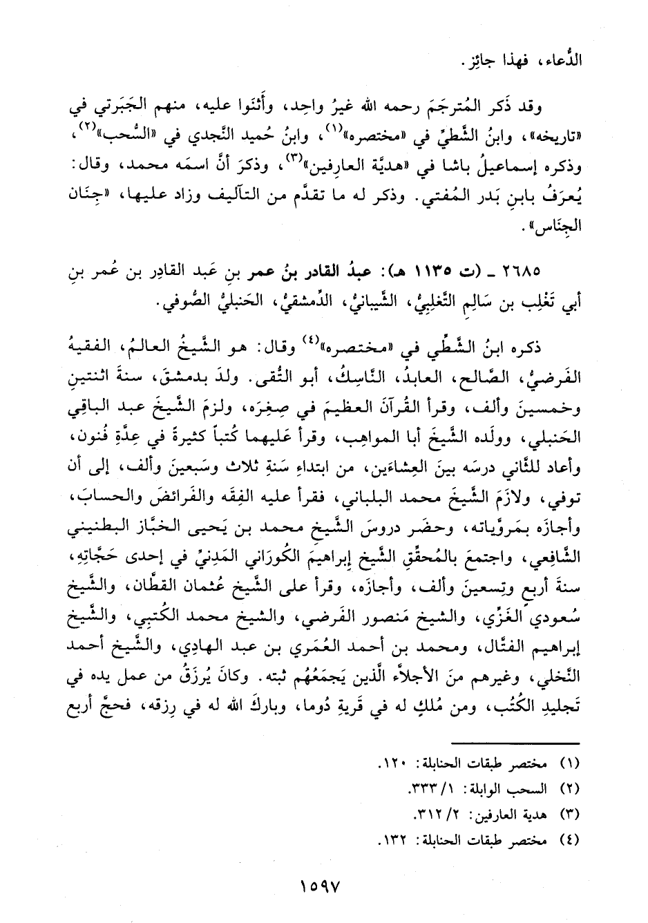 2685 - (ت 1135 هـ): عبدُ القادر بنُ عمر بنِ عَبد القادِر بن عُمر بنِ أبي تَغلِب بن سَالِمِ التَّغلِبِيُّ، الشَّيبانيُّ، الدِّمشقيُّ، الحَنبليُّ الصُّوفي.