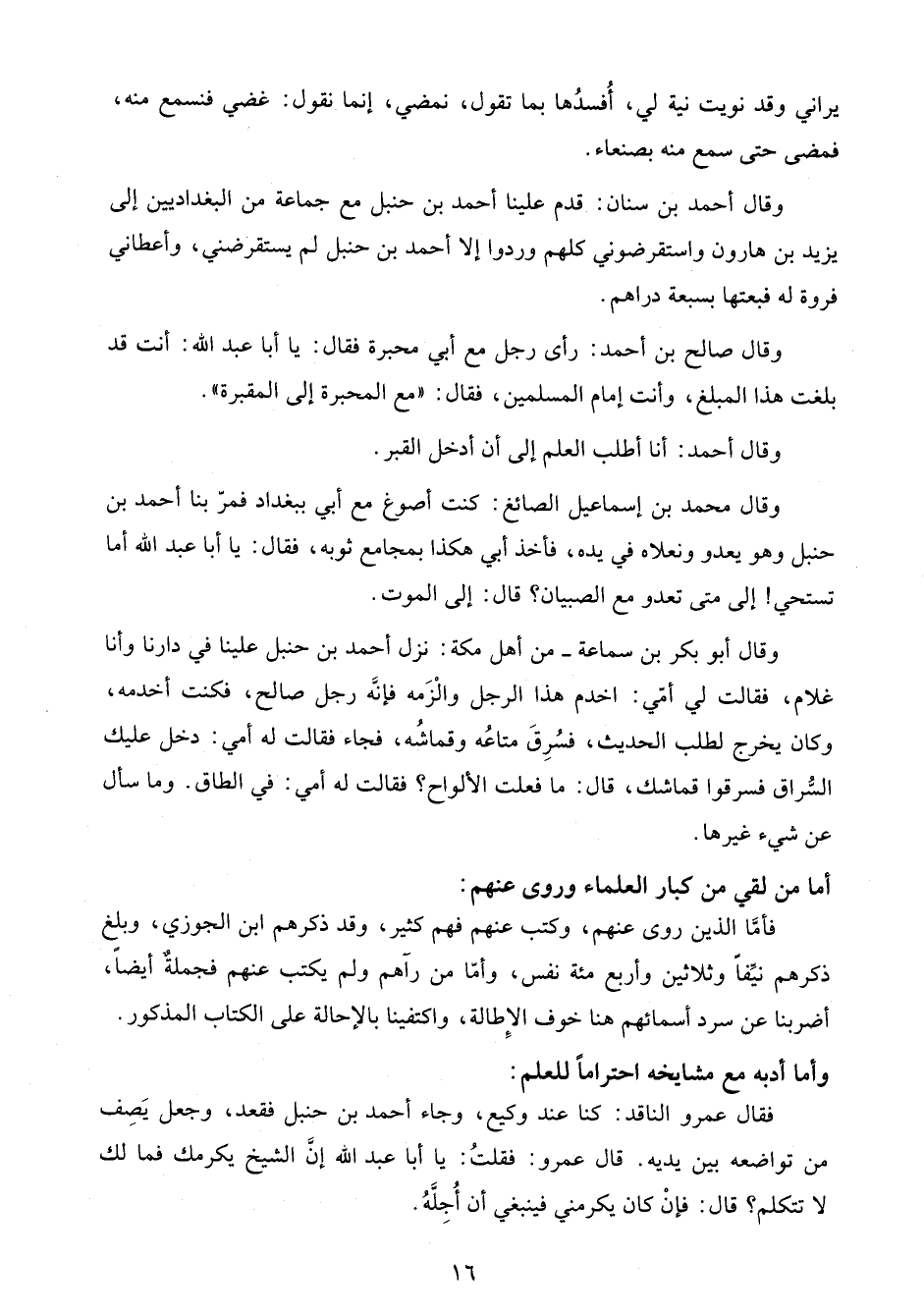 وقال محمد بن إسماعيل الصائغ: كنت أصوغ مع أبي ببغداد فمرّ بنا أحمد بن حنبل وهو يعدو ونعلاه في يده، فأخذ أبي هكذا بمجامع ثوبه، فقال: يا أبا عبد الله أما تستحي! إلى متى تعدو مع الصبيان؟ قال: إلى الموت.