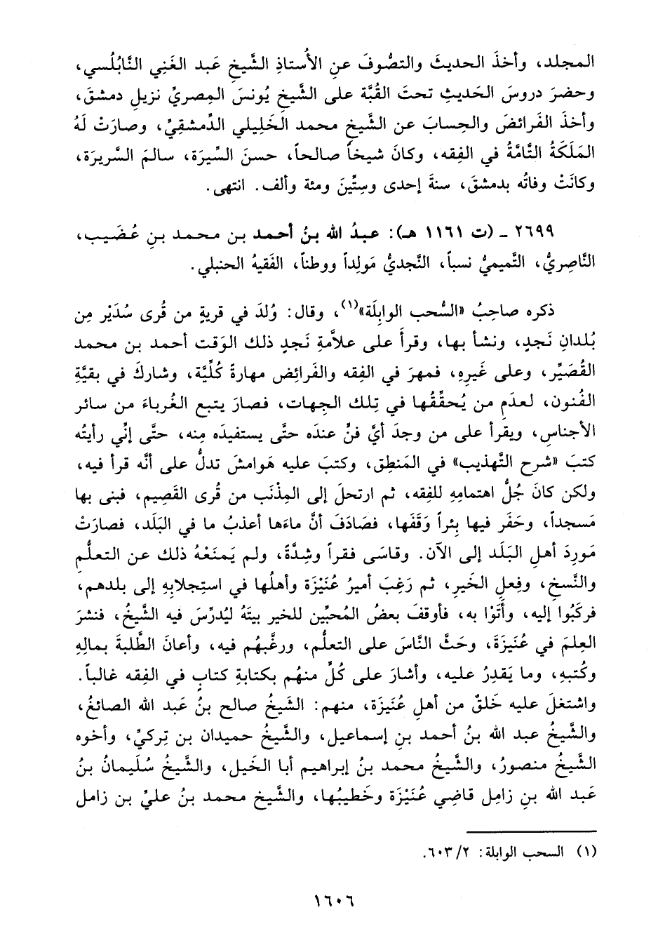 2699 - (ت 1161 هـ): عبدُ الله بنُ أحمد بن محمد بنِ عُضَيب، النَّاصِريُّ، التَّميميُّ نسبًا، النَّجديُّ مَولِدًا ووطنًا، الفَقيهُ الحنبلي.