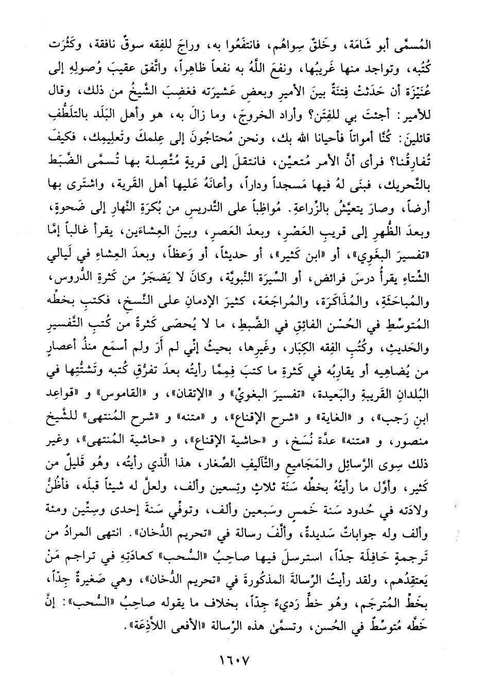 المُسمَّى أبو شَامَة، وخَلقٌ سِواهُم، فانتفَعُوا به، وراجَ للفِقه سوقٌ نافقة، وكَثُرَت كُتُبه، وتواجد منها غَريبُها، ونفعَ اللهُ به نفعًا ظاهِرًا، واتَّفق عقيبَ وُصولِهِ إلى عُنَيْزَة أن حَدَثتْ فِتنَةٌ بينَ الأميرِ وبعضِ عَشيرَته فغضِبَ الشَّيخُ من ذلك، وقال للأمير: أجئتَ بي للفِتَن؟ وأراد الخروجَ، وما زالَ به، هو وأهل البَلَد بالتلَطُّفِ قائلينَ: كُنَّا أمواتًا فأحيانا الله بك، ونحن مُحتاجُونَ إلى عِلمكَ وتَعلِيمِك، فكيفَ تُفارِقُنا؟ فرأى أنَّ الأمر مُتعيَّن، فانتقلَ إلى قريةٍ مُتَّصِلة بها تُسمَّى الضَّبَط بالتَّحريك، فبنَى لهُ فيها مَسجدًا ودارًا، وأعانَهُ عَليها أهل القَرية، واشتَرى بها أرضًا، وصارَ يتعيَّشُ بالزِّراعةِ. مُواظِبًا على التَّدريسِ من بُكرَةِ النَّهارِ إلى ضَحوةٍ، وبعدَ الظُّهرِ إلى قريبِ العَصْرِ، وبعدَ العَصرِ، وبينَ العِشاءَين، يقرأ غالبًا إمَّا "تفسيرَ البغَوِي"، أو "ابن كَثير"، أو حديثًا، أو وَعظًا، وبعدَ العِشاءِ في لَيالي الشِّتاءِ يقرأُ درسَ فرائض، أو السِّيرَة النَّبويَّة، وكانَ لا يَضجَرُ من كَثرةِ الدُّروس، والمُباحَثَةِ، والمُذَاكَرَة، والمُراجَعَة، كثيرَ الإدمانِ على النَّسخِ، فكتبِ بخطَّه المُتوسَّطِ في الحُسْن الفائِقِ في الضَّبطِ، ما لا يُحصَى كَثرةً من كُتبِ التَّفسيرِ والحَديثِ، وكُتُبِ الفِقه الكِبَار، وغَيرِها، بحيثُ إنِّي لم أَرَ ولم أسمَع منذُ أعصارٍ من يُضاهِيه أو يقارِبُه في كَثرةِ ما كتبَ فِمِمَّا رأيتُه بعدَ تفرُّقِ كُتبه وتَشتُّتِها في البُلدانِ القَريبةِ والبَعيدة، "تفسيرَ البغويِّ" و"الإتقان"، و"القاموس" و"قواعِد ابنِ رَجب"، و"الغاية" و"شرح الإقناع"، و"متنه" و"شرح المُنتهى" للشَّيخ منصور، و"متنه" عدَّة نُسَخ، و"حاشية الإقناع"، و"حاشية المُنتهى"، وغير ذلك سِوى الرَّسائِل والمَجَاميعِ والتَّآليفِ الصِّغار، هذا الَّذي رأيتُه، وهُو قَليلٌ من كَثير، وأوَّل ما رأيتُهُ بخطِّه سَنَة ثلاثٍ وتِسعين وألف، ولعلَّ له شيئًا قبلَه، فأظُنُّ ولادَته في حُدود سَنة خَمسٍ وسَبعين وألف، وتوفَّي سَنةَ إحدى وسِتَّين ومئة وألف وله جواباتٌ سَديدةٌ، وألَّفَ رسالة في "تحريم الدُّخان". انتهى المرادُ من تَرجمةٍ حَافِلَة جدًّا، استرسلَ فيها صاحِبُ "السُّحب" كعادَتِهِ في تراجم مَنْ يَعتقِدُهم، ولقد رأيتُ الرِّسالةَ المذكُورةَ في "تحريم الدُّخان"، وهي صَغيرةٌ جِدًّا، بخَطَّ المُترجَم، وهُو خطٌّ رَديءٌ جِدًّا، بخلاف ما يقوله صاحِبُ "السُّحب": إنَّ خَطَّه مُتوسِّطٌ في الحُسن، وتسمَّى هذه الرِّسالة "الأفعى اللَّاذِعَة".