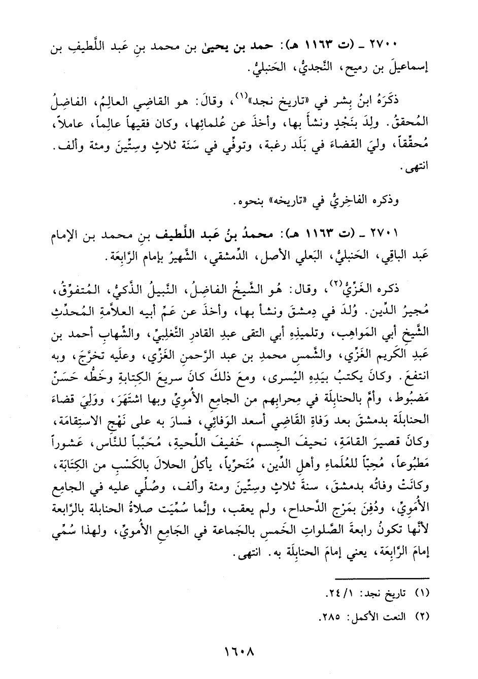 2701 - (ت 1163 هـ): محمدُ بنُ عَبد اللَّطيف بنِ محمد بن الإمام عَبد الباقِي، الحَنبليُّ، البَعلي الأصل، الدِّمشقي، الشَّهيرُ بإمام الرَّابِعَة.