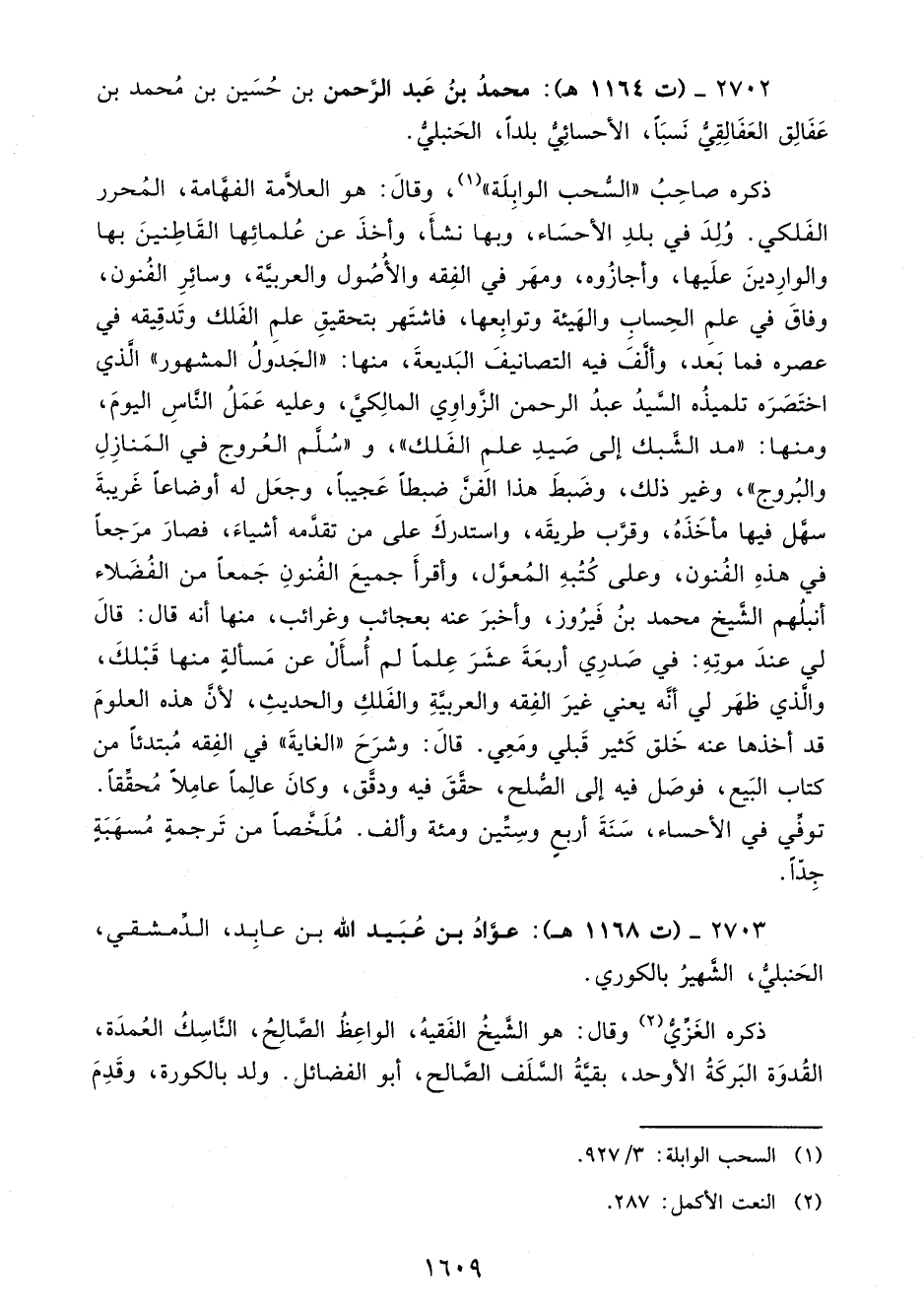 2702 - (ت 1164 هـ): محمدُ بنُ عَبد الرَّحمن بن حُسَين بن مُحمد بن عَفَالِق العَفَالِقِيُّ نَسَبًا، الأحسائِيُّ بلدًا، الحَنبليُّ.