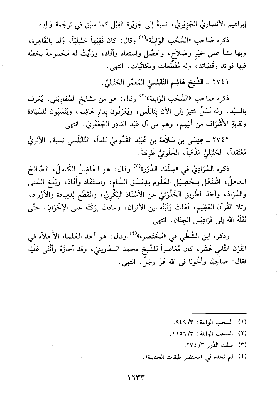 2742 - عِيسَى بن سَلَامة بن عُبَيْد القَدُّوميُّ بَلَدًا، النَّابُلُسي نسبة، الأثريُّ مُعْتَقدًا، الحَنْبَليُّ مَذْهَبًا، الخَلْوتيُّ طَرِيْقةً.