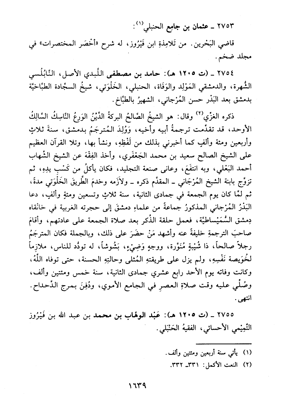 2754 - (ت 1205 هـ): حامد بن مصطفى اللَّبدي الأصل، النَّابُلُسي الشُّهرة، والدمشقي المَوْلِد والوَفَاة، الحنبلي، الخَلْوَتي، شيخُ السجَّادة الطبَّاخيَّة بدمشق بعد البَدْر حسن المُرْجاني، الشهيرُ بالطبَّاخ.