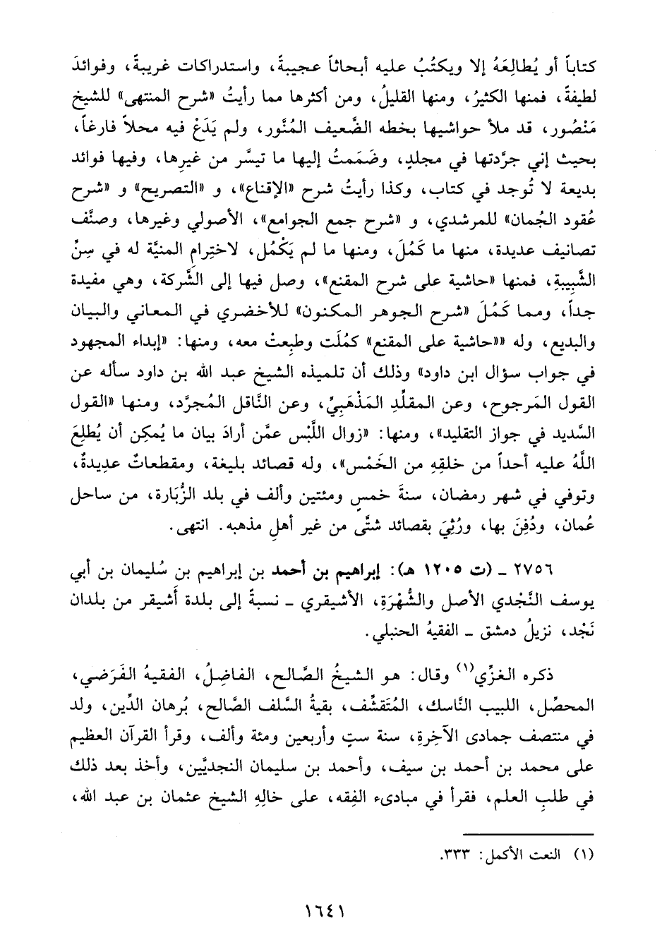 كتابًا أو يُطالِعَهُ إلا ويكتُبُ عليه أبحاثًا عجيبةً، واستدراكات غريبةً، وفوائدَ لطيفةً، فمنها الكثيرُ، ومنها القليلُ، ومن أكثرها مما رأيتُ "شرح المنتهى" للشيخ مَنْصُور، قد ملأ حواشيها بخطه الضَّعيف المُنَّور، ولم يَدَعْ فيه محلًا فارغًا، بحيث إني جرَّدتها في مجلدٍ، وضَمَمتُ إليها ما تيسَّر من غيرِها، وفيها فوائد بديعة لا تُوجد في كتاب، وكذا رأيتُ شرح "الإقناع"، و"التصريح" و"شرح عُقود الجُمان" للمرشدي، و"شرح جمع الجوامع"، الأصولي وغيرها، وصنَّف تصانيف عديدة، منها ما كَمُلَ، ومنها ما لم يَكْمُل، لاختِرامِ المنيَّة له في سِنِّ الشَّبيبةِ، فمنها "حاشية على شرح المقنع"، وصل فيها إلى الشَّركة، وهي مفيدة جدًا، ومما كَمُلَ "شرح الجوهر المكنون" للأخضري في المعاني والبيان والبديع، وله ""حاشية على المقنع" كمُلَت وطبِعت معه، ومنها: "إبداء المجهود في جواب سؤال ابن داود" وذلك أن تلميذه الشيخ عبد الله بن داود سأله عن القول المَرجوح، وعن المقلِّدِ المَذْهَبِيَّ، وعن النَّاقل المُجرِّد، ومنها "القول السَّديد في جواز التقليد"، ومنها: "زوال اللَّبْس عمَّن أرادَ بيان ما يُمكِن أن يُطلِعَ اللهُ عليه أحدًا من خلقِهِ من الخَمْس"، وله قصائد بليغة، ومقطعاتٌ عدِيدةٌ، وتوفي في شهر رمضان، سنةَ خمسٍ ومئتين وألف في بلد الزُّبَارة، من ساحل عُمان، ودُفِنَ بها، ورُثِيَ بقصائد شتَّى من غير أهلِ مذهبه. انتهى.