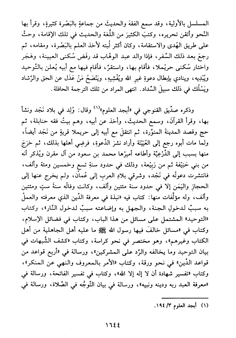 وذكره صدَّيق القنوجي في "أبجد العلوم" (¬1) وقال: وُلِد في بلاد نَجْد ونشأ بها، وقرأ القرآنَ، وسمع الحديثَ، وأخذ عن أبيه، وهم بيتُ فقه حنابلة، ثم حج وقصد المدينةَ المنوَّرة، ثم انتقلَ مع أبيه إلى حريملا قريةٍ من نَجْد أيضًا، ولما مات أبوه رجع إلى العُيَيْنَة وأراد نشرَ الدَّعوةِ، فرضِي أهلها بذلك، ثم خرَجَ منها بسبب إلى الدَّرْعِيَّة وأطاعه أميرُها محمد بن سعود من آل مقرن ويُذكر أنه من بني حَنِيْفة ثم من رَبِيْعة، وذلك في حدود سنةِ تسعٍ وخمسين ومئة وألف، فانتشرت دعوتُه في نَجْد، وشرقي بلادِ العرب إلى عُمان، ولم يخرج عنها إلى الحجازِ واليَمَن إلا في حدود سنة مئتين وألفَ، وكانت وفاتُه سنةَ ستٍ ومئتين وألف، وله مؤلَّفات منها: كتاب فيه "نبذة في معرفة الدِّين الذي معرفته والعملُ به سببٌ لدخولِ الجنة، والجهل به وإضاعته سببٌ لدخول النَّار"، وكتاب "التوحيد" المشتمل على مسائل من هذا الباب، وكتاب في فضائل الإسلام، وكتاب في "مسائل خالفَ فيها رسول الله - صلى الله عليه وسلم - ما عليه أهل الجاهلية من أهل الكتاب وغيرهم"، وهو مختصر في نحو كراسة، وكتاب "كشف الشُّبهات في بيان التوحيد وما يخالفه والرَّد على المشركين"، ورسالة في "أربع قواعد من قواعد الدِّين" في نحو ورقة، وكتاب "الأمر بالمعروف والنهي عن المنكر"، وكتاب "تفسير شهادة أن لا إله إلا الله"، وكتاب في تفسير الفاتحة، ورسالة في "معرفة العبد ربه ودينه ونبيه"، ورسالة في بيان التَّوجُّه في الصَّلاة، ورسالة في