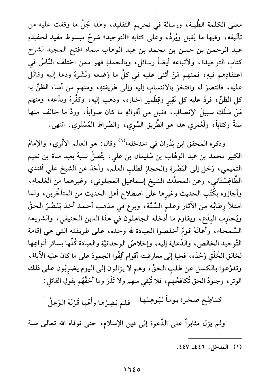 وذكره المحقق ابن بَدْران في "مدخله" (¬1) وقال: هو العالم الأَثَري، والإمامُ الكبير محمد بن عبد الوهَّاب بن سُليمان بن علي، يتَّصلُ نسبهُ بعبد مناة بن تميم التميمي، رَحَل إلى البَصْرة والحجازِ لطلبِ العلم، وأخذ عن الشيخ علي أفندي الطَّاغِسْتَاني، وعن المحدِّث الشيخ إسماعيل العجلوني، وغيرهما من العَلماءِ، وأجازوه بكُتُبِ الحديث وغيرِها على اصطلاح أهل الحديث من المتأخَّرين، ولما امتلأ وِطابُه من الآثار وعلم السُّنَّة، وبرع في مذهب أحمد أخذ يَنْصُرُ الحقَّ ويُحارِب البِدَع، ويقاوم ما أدخله الجاهِلون في هذا الدين الحنيفي، والشريعة السَّمحاء، وأعانَهُ قومٌ أخلصوا العبادة لله وحده، على طريقته التي هي إقامة التَّوحيد الخالص، والدَّعاية إليه، وإخلاصُ الوحدانيَّةِ والعبادة كُلِّها بسائر أنواعِها لخالقِ الخَلْقِ وَحْدَه، فحبا إلى معارضته أقوام ألِفُوا الجمودَ على ما كان عليه الآباءُ، وتدرَّعوا بالكسل عن طلبِ الحقَّ، وهم لا يزالون إلى اليوم يضرِبُون على ذلك الوتر، وجنودُ الحق تُكافحُهم، فلا تُبْقي منهم ولا تَذَرَ وما أحَقهُم بقولِ القائلِ: