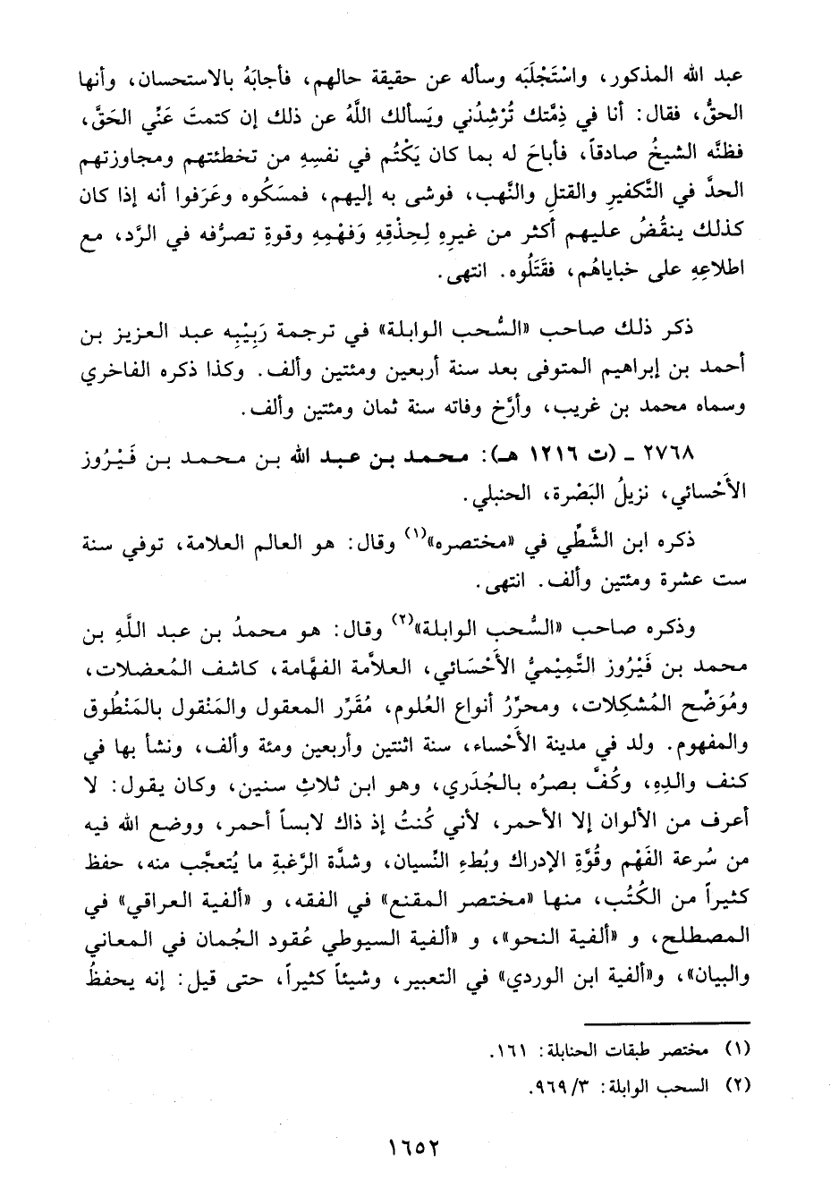 وذكره صاحب "السُّحب الوابلة" (¬2) وقال: هو محمدُ بن عبد اللهِ بن محمد بن فَيْرُوز التَّمِيْميُّ الأَحْسَائي، العلَّامة الفهَّامة، كاشف المُعضلات، ومُوَضِّح المُشكِلات، ومحرِّرُ أنواع العُلوم، مُقَرِّر المعقول والمَنْقول بالمَنْطُوق والمفهوم. ولد في مدينة الأَحْساء، سنة اثنتين وأربعين ومئة وألف، ونشأ بها في كنف والدِهِ، وكُفَّ بصرُه بالجُدَري، وهو ابن ثلاثٍ سنين، وكان يقول: لا أعرف من الألوان إلا الأحمر، لأني كُنتُ إذ ذاك لابسًا أحمر، ووضع الله فيه من سُرعة الفَهْم وقُوَّةِ الإدراك وبُطءِ النِّسيان، وشدَّة الرَّغبةِ ما يُتعجَّب منه، حفظ كثيرًا من الكُتُب، منها "مختصر المقنع" في الفقه، و"ألفية العراقي" في المصطلح، و"ألفية النحو"، و"ألفية السيوطي عُقود الجُمان في المعاني والبيان"، و"ألفية ابن الوردي" في التعبير، وشيئًا كثيرًا، حتى قيل: إنه يحفظُ