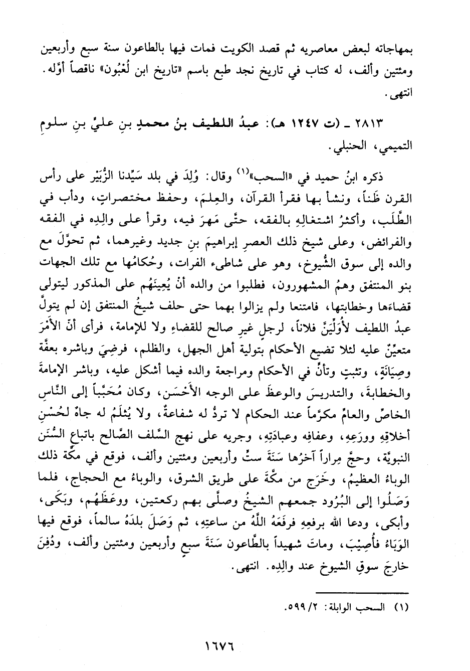 ذكره ابنُ حميد في "السحب" (¬1) وقال: وُلِدَ في بلد سَيِّدنا الزُّبَيْر على رأس القرن ظَنًا، ونشأ بها فقرأ القرآن، والعِلمَ، وحفظ مختصراتٍ، ودأب في الطَّلَب، وأكثرُ اشتغالِهِ بالفقه، حتَّى مَهرَ فيه، وقرأ على والِدِه في الفقه والفرائض، وعلى شيخ ذلك العصرِ إبراهيمَ بنِ جديد وغيرهما، ثم تحوَّلَ مع والده إلى سوق الشُّيوخ، وهو على شاطئ الفرات، وحُكامُها مع تلك الجهات بنو المنتفق وهمُ المشهورون، فطلبوا من والده أنْ يُعِينَهُم على المذكور ليتولى قضاءَها وخطابتها، فامتنعا ولم يزالوا بهما حتى حلف شيخُ المنتفق إن لم يتولَّ عبدُ اللطيف لأُوَلِّيَنَّ فلانًا، لرجلٍ غيرِ صالح للقضاءِ ولا للإمامة، فرأى أن الأَمْرَ متعيِّنٌ عليه لئلا تضيع الأحكام بتولية أهل الجهل، والظلم، فرضِيَ وباشره بعفَّة وصِيَانَةٍ، وتثبتٍ وتأنٍّ في الأحكام ومراجعة والده فيما أشكل عليه، وباشر الإمامةَ والخطابةَ، والتدريسَ والوعظَ على الوجه الأَحْسَن، وكان مُحَبَّبًا إلى النَّاسِ الخاصِّ والعامِّ مكرَّمًا عند الحكام لا تردُّ له شفاعةٌ، ولا يُثلَمُ له جاهٌ لحُسْنِ أخلاقِهِ وورَعِهِ، وعفافِه وعبادَتِهِ، وجريه على نهج السَّلف الصَّالح باتباع السُّنَن النبويَّة، وحجَّ مِرارًا آخرُها سَنَةَ ستٍّ وأربعين ومئتين وألف، فوقع في مكَّة ذلك الوباءُ العظيمُ، وخَرَج من مكَّةَ على طريق الشرق، والوباءُ مع الحجاج، فلما وَصَلُوا إلى البُرُود جمعهم الشيخُ وصلَّى بهم ركعتين، ووعَظَهُم، وبَكَى، وأبكى، ودعا الله برفعِهِ فرفَعَهُ اللهُ من ساعتِهِ، ثم وَصَلَ بلدَهُ سالمًا، فوقع فيها الوَبَاءُ فأُصِيْبَ، وماتَ شهيدًا بالطَّاعون سَنَةَ سبعٍ وأربعين ومئتين وألف، ودُفِنَ خارجَ سوقِ الشيوخ عند والِدِه. انتهى.
