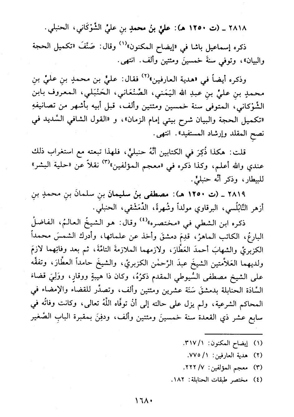 2818 - (ت 1250 هـ): عليٌّ بنُ محمدٍ بنِ عليٍّ الشَّوْكَاني، الحنبلي.