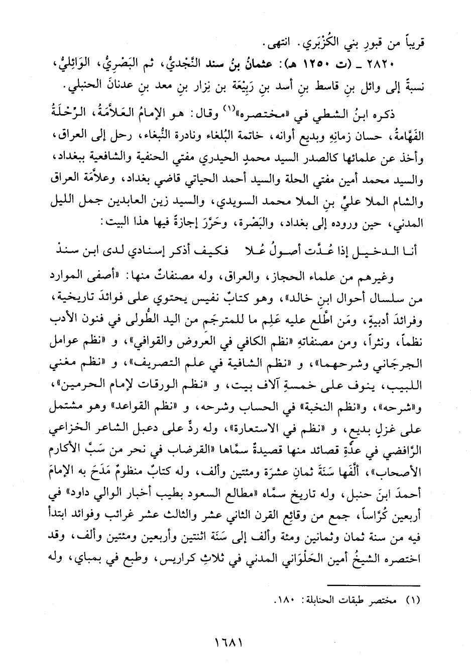 2820 - (ت 1250 هـ): عثمانُ بنُ سند النَّجْديُّ، ثم البَصْرِيُّ، الوَائِليُّ، نسبةً إلى وائل بنِ قاسط بنِ أسد بنِ رَبِيْعَة بن نِزار بنِ معد بنِ عدنانَ الحنبلي.