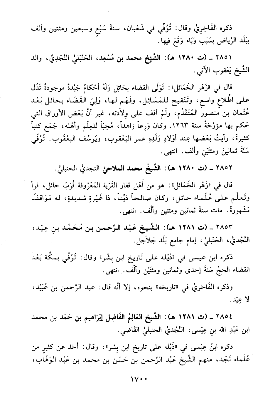 2851 - (ت 1280 هـ): الشَّيْخ محمد بن مُسْعِد، الحَنْبَليُّ النَّجْدِيُّ، والد الشَّيخ يَعْقوب الآتي.