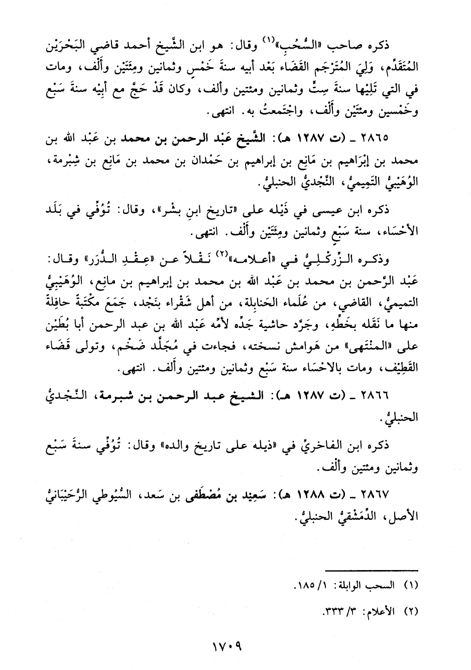 2865 - (ت 1287 هـ): الشَّيخ عَبد الرحمن بن محمد بن عَبْد الله بن محمد بن إبْرَاهيم بن مَانِع بن إبراهيم بن حَمْدان بن محمد بن مَانِع بن شِبْرمة، الوُهَيْبيُّ التَمِيميُّ، النَّجْديُّ الحنبليُّ.