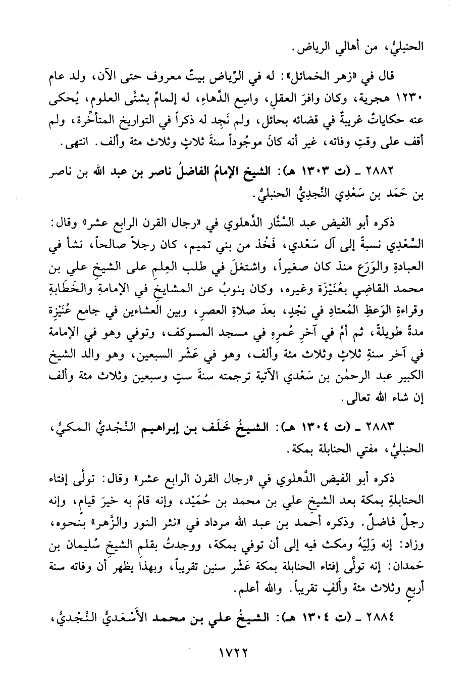 2882 - (ت 1303 هـ): الشَّيخ الإمامُ الفاضلُ ناصر بن عبد الله بن ناصر بن حَمَد بن سَعْدِي النَّجدِيُّ الحنبليُّ.