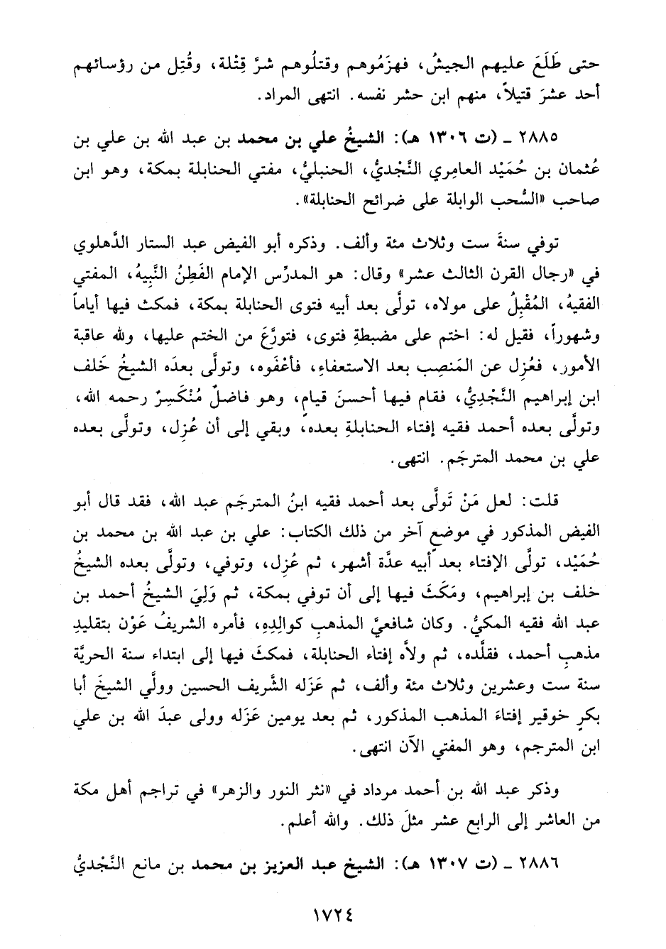 2885 - (ت 1306 هـ): الشيخُ علي بن محمد بن عبد الله بن علي بن عُثمان بن حُمَيْد العامِري النَّجْديُّ، الحنبليُّ، مفتي الحنابلة بمكة، وهو ابن صاحب "السُّحب الوابلة على ضرائح الحنابلة".