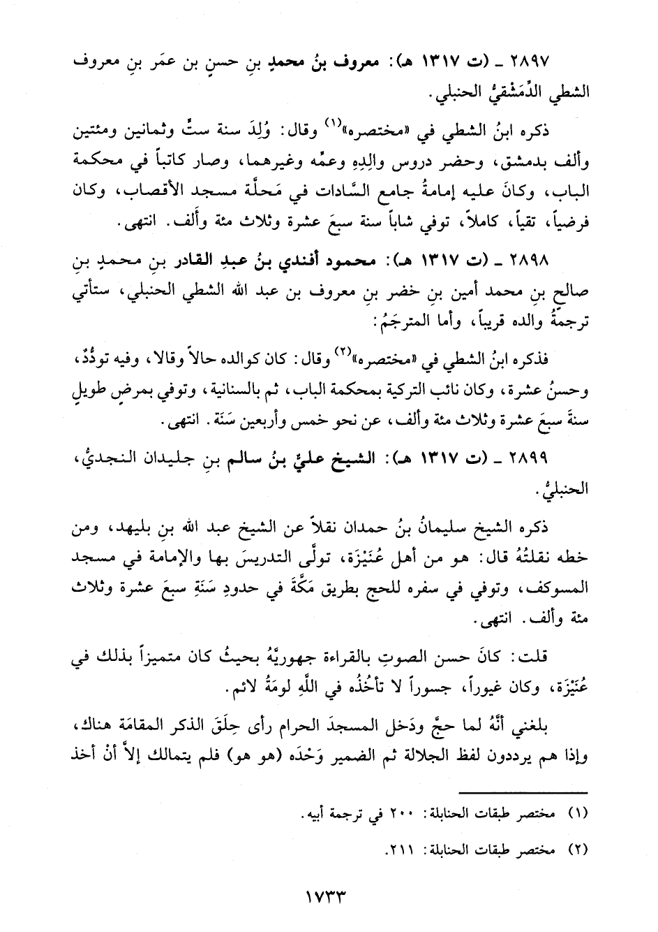 2898 - (ت 1317 هـ): محمود أفندي بنُ عبدِ القادر بنِ محمدٍ بنِ صالحٍ بنِ محمد أمين بنِ خضر بنِ معروف بن عبد الله الشطي الحنبلي، ستأتي ترجمةُ والده قريبًا، وأما المترجَمُ: