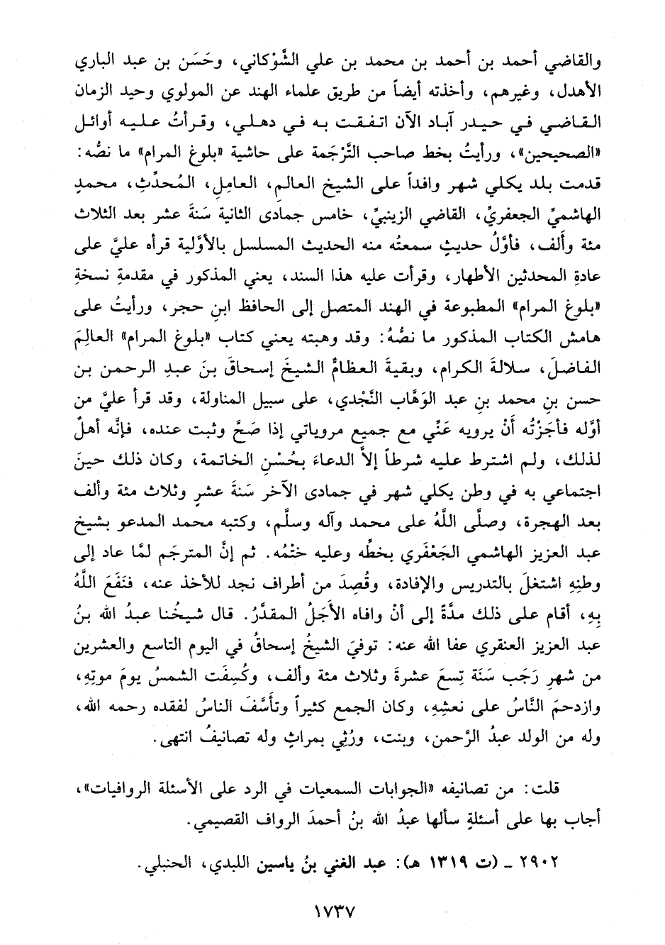 والقاضي أحمد بن أحمد بن محمد بن علي الشَّوْكاني، وحَسَن بن عبد الباري الأهدل، وغيرهم، وأخذته أيضًا من طريق علماء الهند عن المولوي وحيد الزمان القاضي في حيدر آباد الآن اتفقت به في دهلي، وقرأتُ عليه أوائل "الصحيحين"، ورأيتُ بخط صاحب التَّرْجَمة على حاشية "بلوغ المرام" ما نصُّه: قدمت بلد يكلي شهر وافدًا على الشَّيخ العالمِ، العامِلِ، المُحدِّثِ، محمدِ الهاشميِّ الجعفريِّ، القاضي الزينبيِّ، خامس جمادى الثانية سَنةَ عشر بعد الثلاث مئة وأَلْف، فأوَّلُ حديثٍ سمعتُه منه الحديث المسلسل بالأوَّلية قرأه عليَّ على عادةِ المحدثين الأطهار، وقرأت عليه هذا السند، يعني المذكور في مقدمةِ نسخةِ "بلوغ المرام" المطبوعة في الهند المتصل إلى الحافظ ابنِ حجر، ورأيتُ على هامش الكتاب المذكور ما نصُّهُ: وقد وهبته يعني كتاب "بلوغ المرام" العالِمَ الفاضلَ، سلالةَ الكرام، وبقيةَ العظامُّ الشيخَ إسحاقَ بنَ عبدِ الرحمن بن حسن بنِ محمد بنِ عبد الوَهَّاب النَّجْدي، على سبيل المناولة، وقد قرأ عليَّ من أوَّله فأجَزْتُه أَنْ يرويه عَنِّي مع جميع مروياتي إذا صَحَّ وثبت عنده، فإنَّه أهلٌ لذلك، ولم اشترط عليه شرطًا إلَّا الدعاءَ بحُسْنِ الخاتمة، وكان ذلك حينَ اجتماعي به في وطن يكلي شهر في جمادى الآخر سَنةَ عشرٍ وثلاث مئة وألف بعد الهجرة، وصلَّى اللهُ على محمد وآله وسلَّم، وكتبه محمد المدعو بشيخ عبد العزيز الهاشمي الجَعْفَري بخطِّه وعليه ختْمُه. ثم إنَّ المترجَم لمَّا عاد إلى وطنِهِ اشتغلَ بالتدريس والإفادة، وقُصِدَ من أطراف نجد للأخذ عنه، فنَفَعَ اللهُ بِهِ، أقام على ذلك مدَّةٌ إلى أنْ وافاه الأَجَلُ المقدَّرُ. قال شيخُنا عبدُ الله بنُ عبد العزيز العنقري عفا الله عنه: توفيَ الشيخُ إسحاقُ في اليوم التاسع والعشرين من شهرِ رَجَب سَنَة تِسعَ عشرةَ وثلاث مئة وألف، وكُسِفَت الشمسُ يومَ موتِهِ، وازدحمَ النَّاسُ على نعشِهِ، وكان الجمع كثيرًا وتأَسَّفَ الناسُ لفقده رحمه الله، وله من الولد عبدُ الرَّحمن، وبنت، ورُثِي بمراثٍ وله تصانيفُ انتهى.