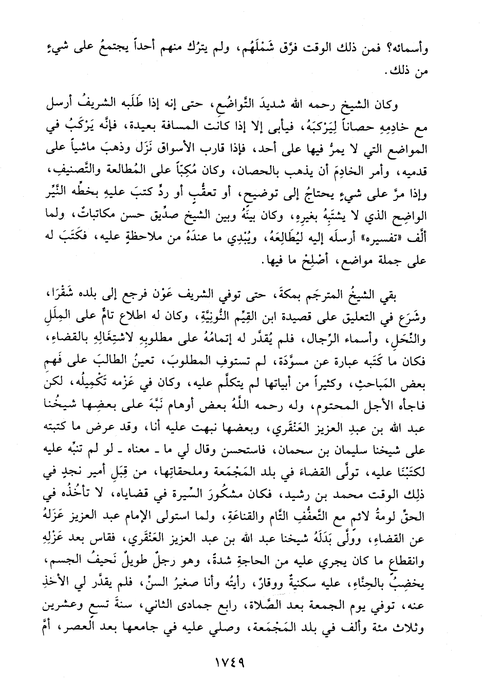 بقي الشيخُ المترجَم بمكةَ، حتى توفي الشريف عَوْن فرجع إلى بلده شَقْرَا، وشَرَع في التعليق على قصيدة ابن القِيِّم النُّونِيَّةِ، وكان له اطلاع تامٌّ على المِلَلِ والنِّحَلِ، وأسماء الرِّجال، فلم يُقدَّر له إتمامُهُ على مطلوبِهِ لاشتِغَالِهِ بالقضاءِ، فكان ما كَتَبه عبارة عن مسوَّدَة، لم تستوفِ المطلوبَ، تعينُ الطالبَ على فَهمِ بعض المَباحثِ، وكثيرًا من أبياتها لم يتكلَّم عليه، وكان في عَزْمه تَكْمِيلُه، لكن فاجأه الأجل المحتوم، وله رحمه اللهُ بعض أوهام نَبَّهَ على بعضِها شيخُنا عبد الله بن عبدِ العزيز العَنْقَري، وبعضها نبهت عليه أنا، وقد عرض ما كتبته على شيخنا سليمان بن سحمان، فاستحسن وقال لي ما - معناه - لو لم تنبِّه عليه لكتَبْنَا عليه، تولَّى القضاءَ في بلد المَجْمَعة وملحقاتِها، من قِبَلِ أمير نجدٍ في ذلِك الوقت محمد بن رشيد، فكان مشكُورَ السِّيرة في قضاياه، لا تأخُذُه في الحقِّ لومةُ لائمٍ مع التَّعفُّفِ التَّام والقناعَةِ، ولما استولى الإمام عبد العزيز عَزَلهُ عن القضاءِ، ووَلَّى بَدَلَهُ شيخنا عبد الله بن عبد العزيز العَنْقَري، فقاس بعد عَزْلِهِ وانقطاعٍ ما كان يجري عليه من الحاجةِ شدة، وهو رجلٌ طويلٌ نَحيفُ الجسم، يخضِبُ بالحِنَّاءِ، عليه سكنيةٌ ووقارٌ، رأيتُه وأنا صغيرُ السن، فلم يقدَّر لي الأخذِ عنه، توفي يوم الجمعة بعد الصَّلاة، رابع جمادى الثاني، سنةَ تسعٍ وعشرين وثلاث مئة وألف في بلد المَجْمَعة، وصلي عليه في جامعها بعد العصر، أمَّ
