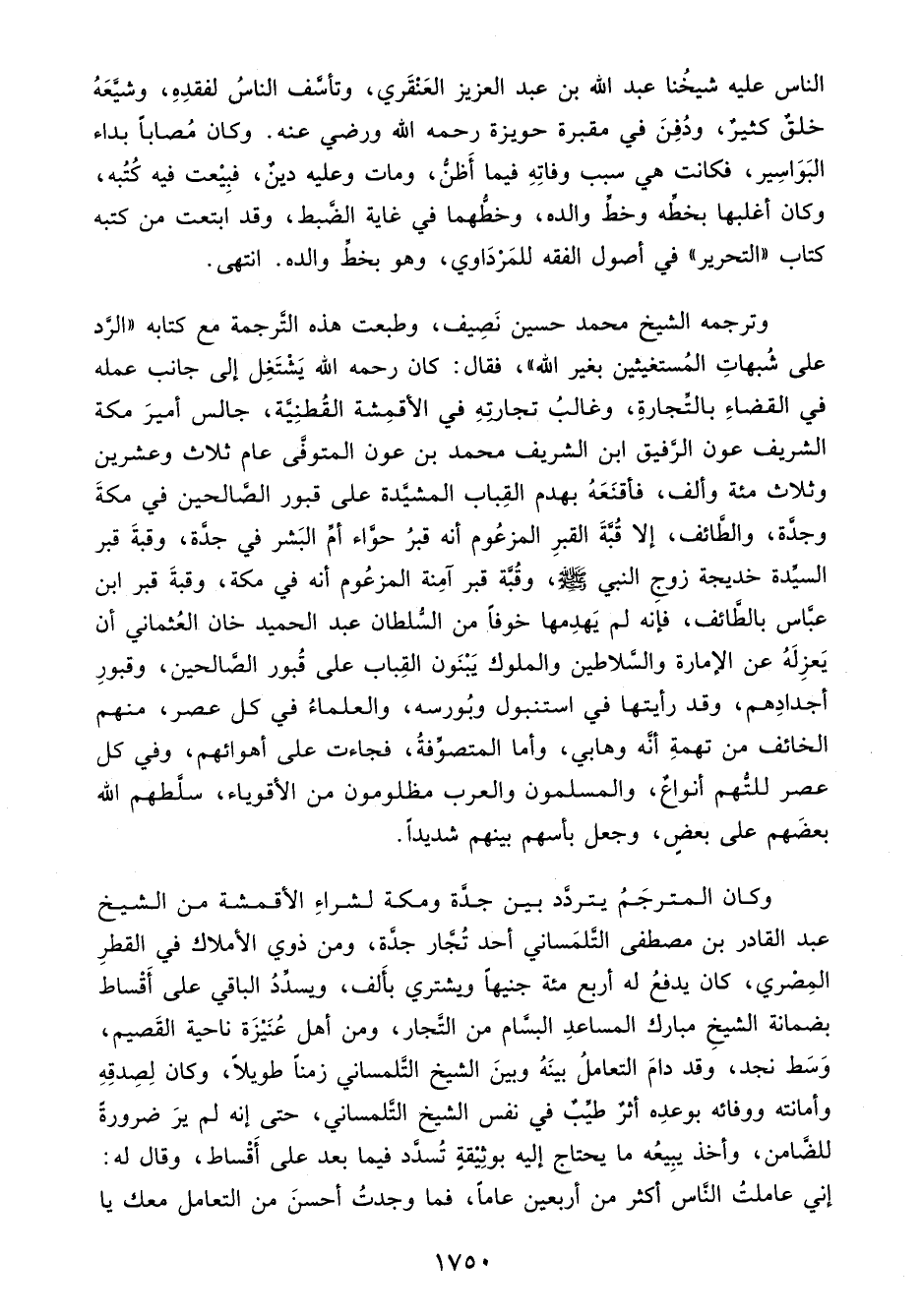وترجمه الشيخ محمد حسين نَصِيف، وطبعت هذه التَّرجمة مع كتابه "الرَّد على شُبهاتِ المُستغيثين بغير الله"، فقال: كان رحمه الله يَشتَغِل إلى جانب عمله في القضاءِ بالتِّجارةِ، وغالبُ تجارتِهِ في الأقمِشة القُطنِيَّة، جالس أميرَ مكة الشريف عون الرَّفيق ابن الشريف محمد بن عون المتوفَّى عام ثلاث وعشرين وثلاث مئة وألف، فأقنَعَهُ بهدم القِباب المشيَّدة على قبور الصَّالحين في مكةَ وجدَّة، والطَّائف، إلا قُبَّةَ القبرِ المزعُوم أنه قبرُ حوَّاء أمِّ البَشر في جدَّة، وقبةَ قبر السيِّدة خديجة زوجِ النبي - صلى الله عليه وسلم -، وقبَّة قبر آمِنة المزعُوم أنه في مكة، وقبةَ قبر ابن عبَّاس بالطَّائف، فإنه لم يَهدِمها خوفًا من السُّلطان عبد الحميد خان العُثماني أن يَعزِلَهُ عن الإمارة والسَّلاطين والملوك يَبْنَون القِباب على قُبور الصَّالحين، وقبورِ أجدادِهم، وقد رأيتها في استنبول وبُورسه، والعلماءُ في كل عصر، منهم الخائف من تهمةِ أنَّه وهابي، وأما المتصوِّفةُ، فجاءت على أهوائهم، وفي كل عصر للتُّهم أنواعٌ، والمسلمون والعرب مظلومون من الأقوياء، سلَّطهم الله بعضَهم على بعضٍ، وجعل بأسهم بينهم شديدًا.