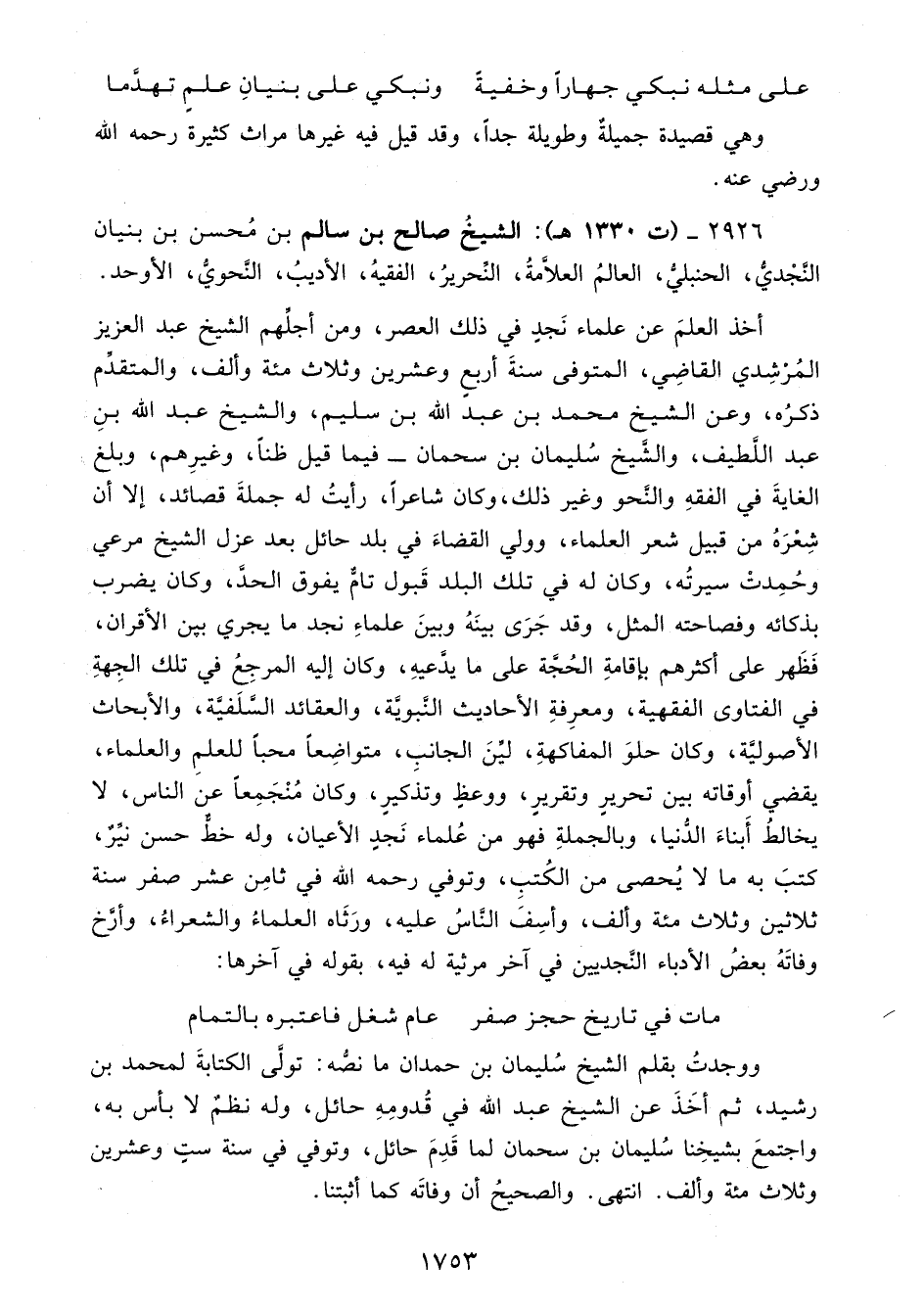 2926 - (ت 1330 هـ): الشيخُ صالح بن سالم بن مُحسن بن بنيان النَّجْديُّ، الحنبليُّ، العالمُ العلَّامةُ، النِّحريرُ، الفقيهُ، الأديبُ، النَّحويُّ، الأوحد.