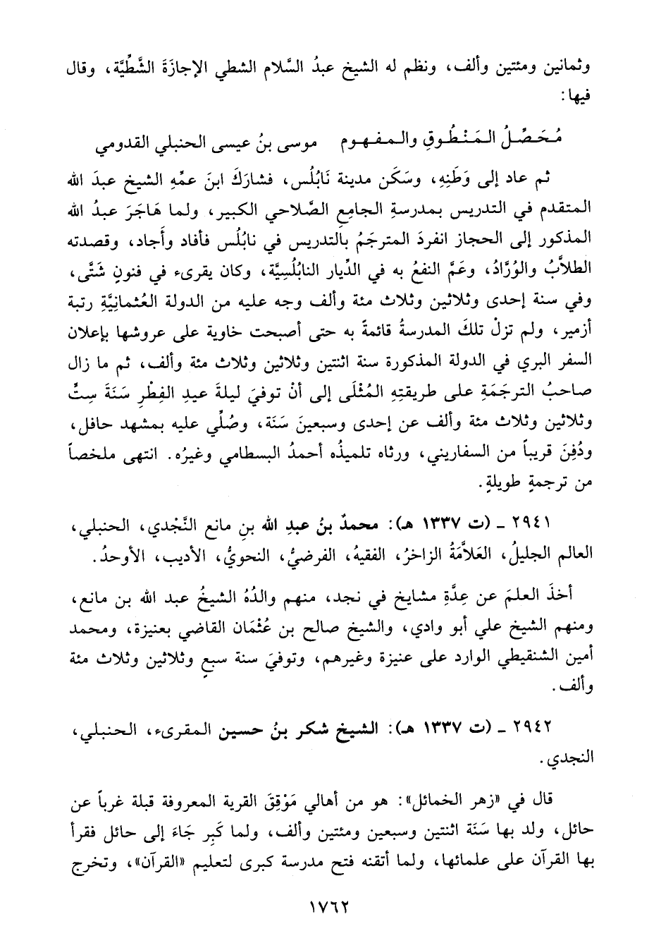 2941 - (ت 1337 هـ): محمدٌ بنُ عبدِ الله بنِ مانع النَّجْدي، الحنبلي، العالم الجليلُ، العَلَّامَةُ الزاخرُ، الفقيهُ، الفرضيُّ، النحويُّ، الأديب، الأوحدُ.
